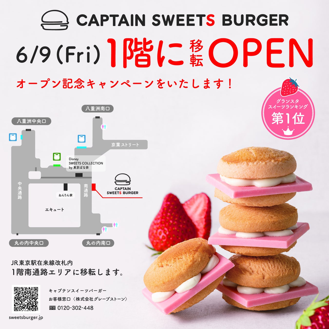 株式会社グレープストーン(本社:東京都中央区銀座)がJR東京駅で展開するスイーツバーガーブランド「CAPTAIN SWEETS BURGER(キャプテンスイーツバーガー)」は、東京駅南通路への移転が決定いたしました。2023年6月9日(金)にJR東京駅在来線改札内1階南通路エリアにてリニューアルオープン、7日間限定でオリジナルトートバッグのプレゼントも行います。https://sweetsburger.jp/