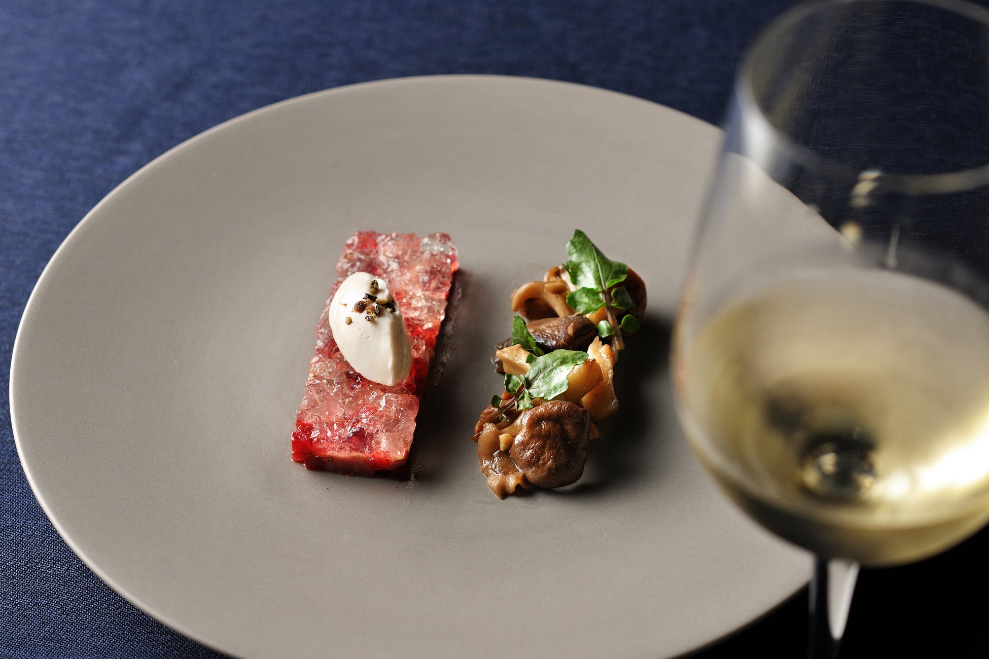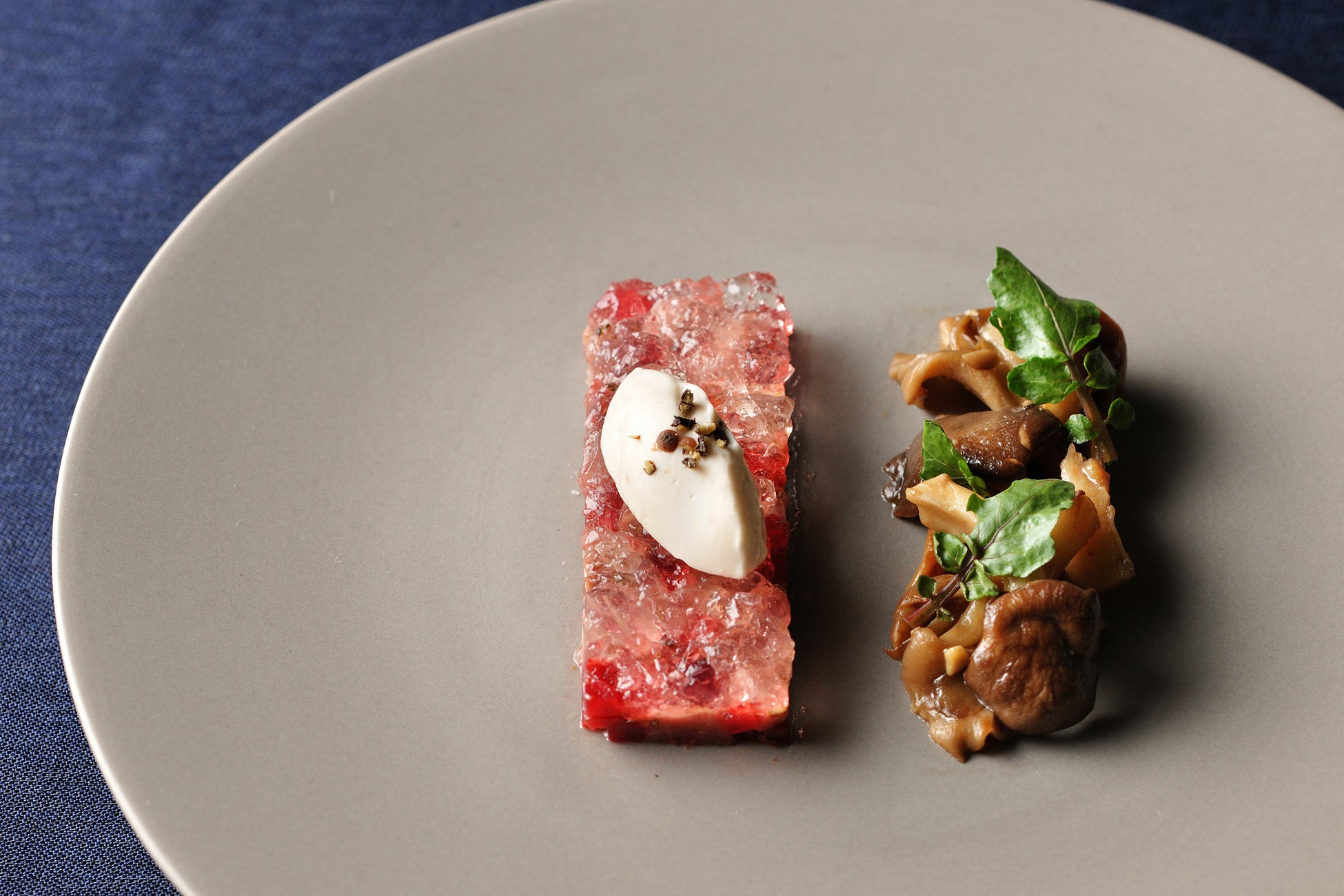 鹿のタルタルを、ジェニパーベリーの甘くスパイシーな香りが特徴的なジンのジュレと合わせました。タルタルは食感を楽しめるよう粗びきにし、3種の茸マリネやクルミのクリームとともに味わいます。