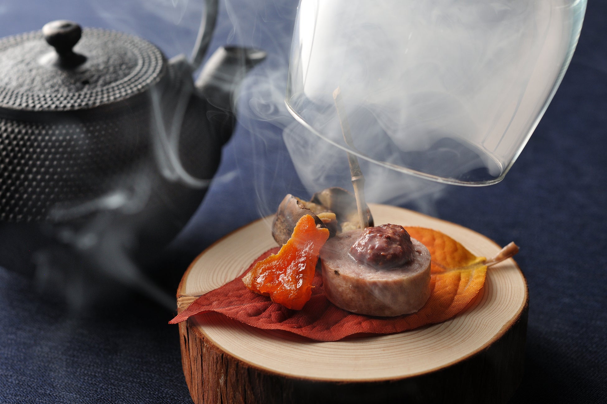 鹿肉のサルシッチャにラズベリーや粒マスタードを合わせ、瞬間燻製して仕上げました。栗や柿と一緒に楽しみます。ガラスの器に霧をイメージした燻製の煙を閉じ込め、秋の森を演出する一品です。