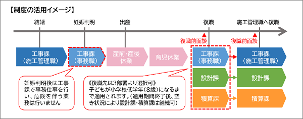 2023年4月より、「ライフイベントと仕事の両立が難しそう」といった、比較的女性比率の低い女性施工管理職の声を取り入れ、妊娠や出産、子育てといったライフイベントに直面した際、工事(事務職)、設計課、積算課の3つの中から希望の職種に転換できる制度を導入しています。