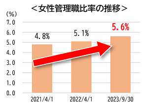当社は2021年より、これまでの「優秀な女性を登用する」という考え方から脱却し、「資質のある女性を見つけて育成し登用する」という考え方をベースにした「女性育成プログラム」を導入しました。その結果、2021年4月1日時点で4.8%であった女性管理職比率が、2023年9月末時点には5.6%と大きく伸長した点が評価されました。