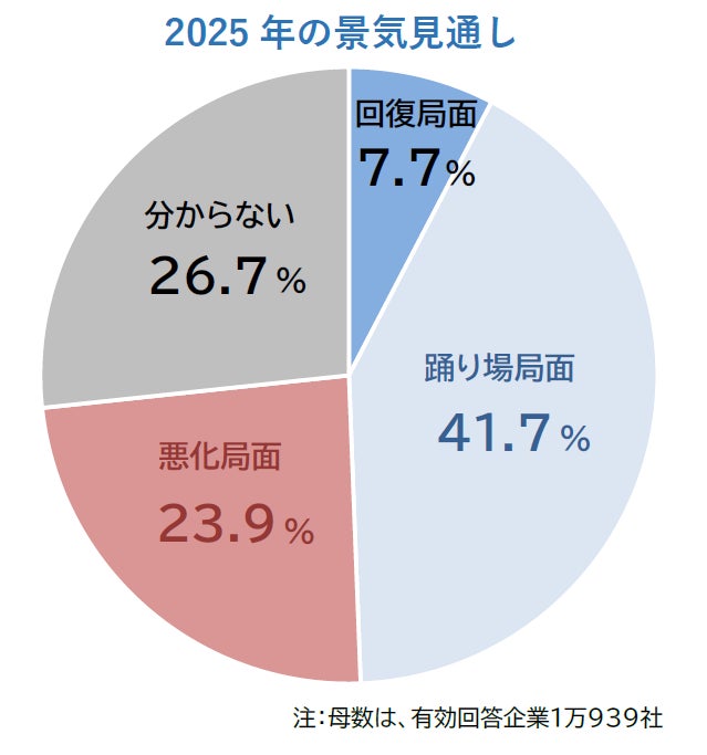 2025年の景気見通し、「回復」局面(7.7%)、「踊り場」局面(41.7%)は2024年の景気見通しからそれぞれ低下。他方、「悪化」局面(23.9%)は3.6ポイント上昇