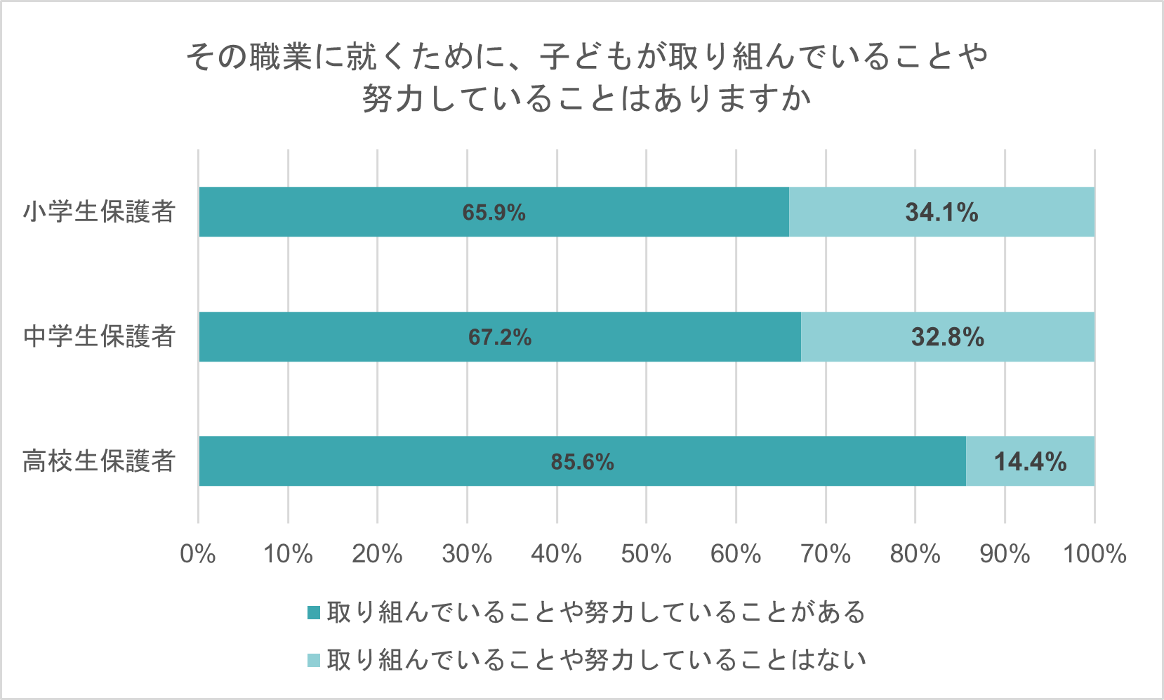 次に、子どもに将来就きたい職業があると回答した保護者に、その職業に就くために、子どもが取り組んでいることや努力していることがあるかを聞いたところ、小学生保護者の65.9%、中学生保護者の67.2%、高校生保護者の85.6%が「取り組んでいることや努力していることがある」と回答した。将来就きたい職業がある子どもは、その目標に向かって努力する傾向が大きいことが分かった。特に高校生においては、将来の職業が小学生・中学生よりも具体的になり、その実現に向けて取り組んでいることがある割合も高くなると考えられる。