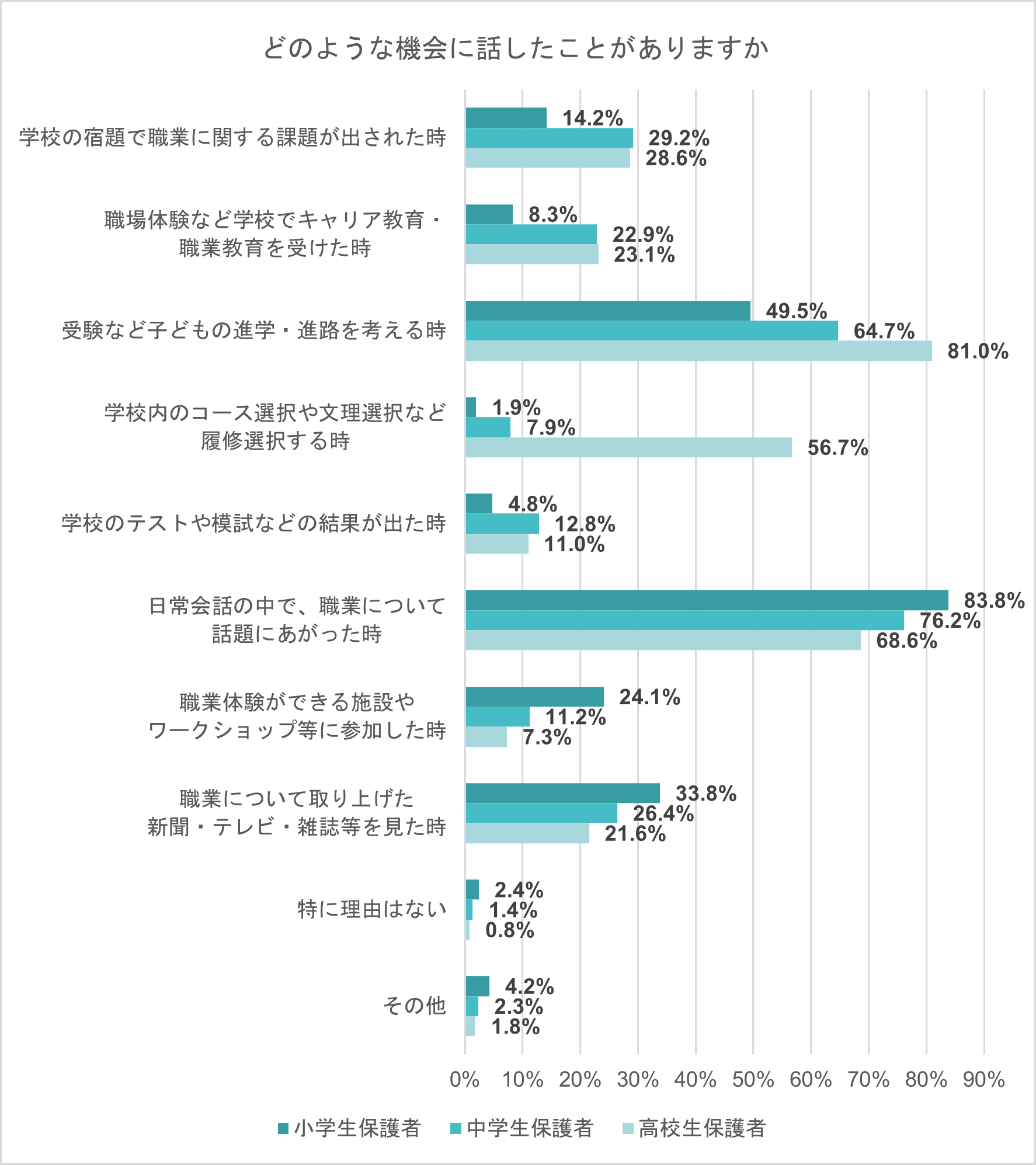 次に、「話したことがある」と回答した保護者に、どのような機会に子どもと話したことがあるかを聞いた。小学生保護者では「日常会話の中で、職業について話題にあがったとき」がもっとも多く83.8%だった。中学生保護者では小学生保護者よりは割合は低いものの「日常会話の中で、職業について話題にあがったとき」がもっとも多く76.2%、高校生保護者は「受験など子どもの進学・進路を考える時」がもっとも高く、81.0%だった。また、高校生では、「学校内のコース選択や文理選択など履修選択をする時」も半数以上にのぼった。