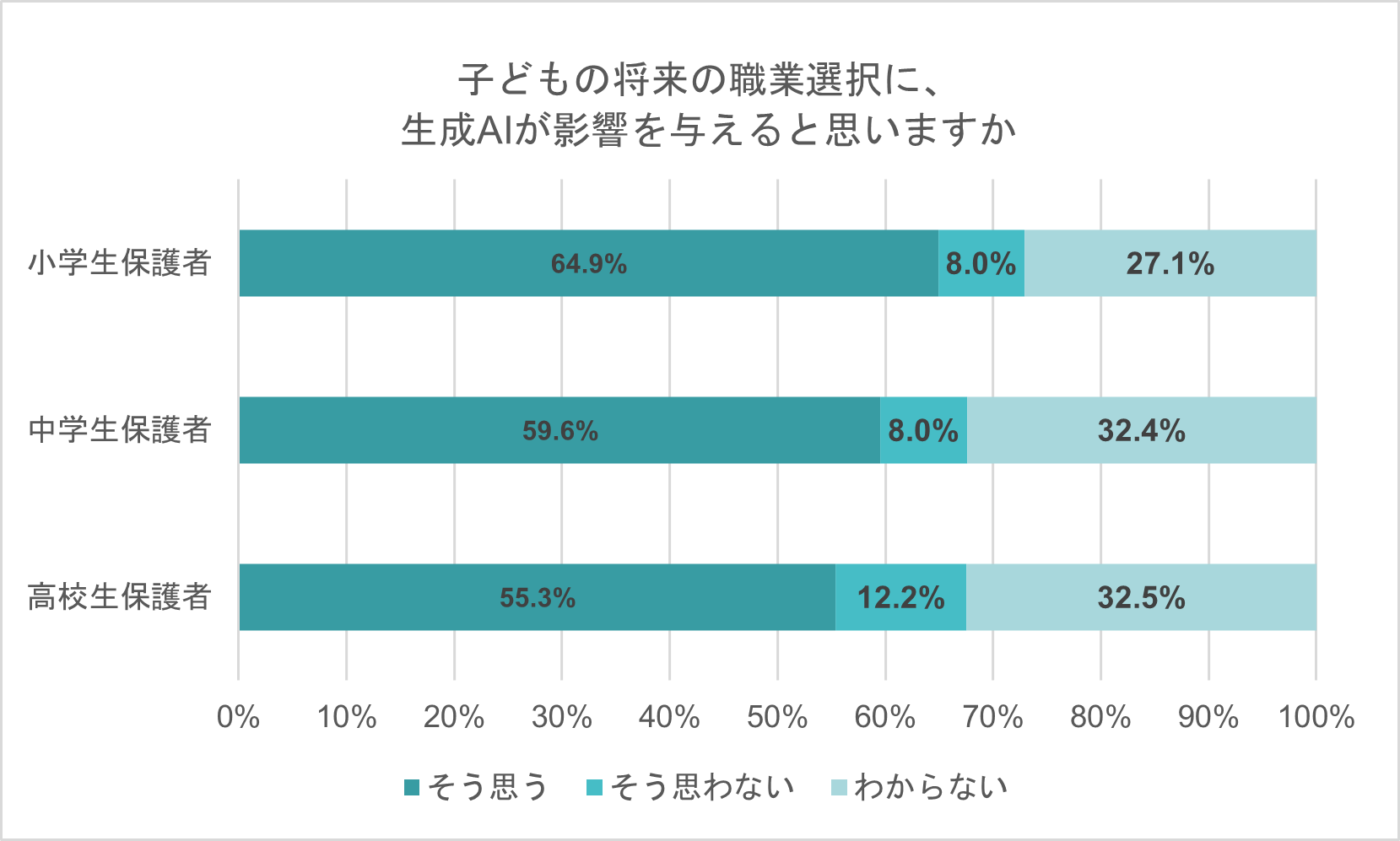 一方で、子どもの将来の職業選択に与える影響は、「そう思う」と回答した保護者が過半数を占めていることが分かった。特に、小学生保護者では64.9%にのぼり、約3分の2の保護者が、子どもの将来の職業選択に生成AIが影響を与えると考えていることが明らかとなった。