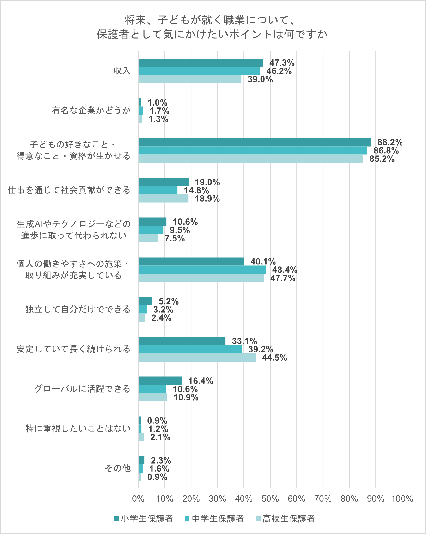 小学生保護者・中学生保護者・高校生保護者の割合を比較すると、「収入」は小学生保護者の方がより重視している傾向にあり、高校生保護者と比べて8.3ポイント高かった。「安定していて長く続けられる」は高校生保護者がより重視している傾向にあり、小学生保護者と比べて11.4ポイント高かった。「グローバルに活躍できる」は小学生保護者がもっとも高く、中学生保護者と比べて5.8ポイント高いことが分かった。