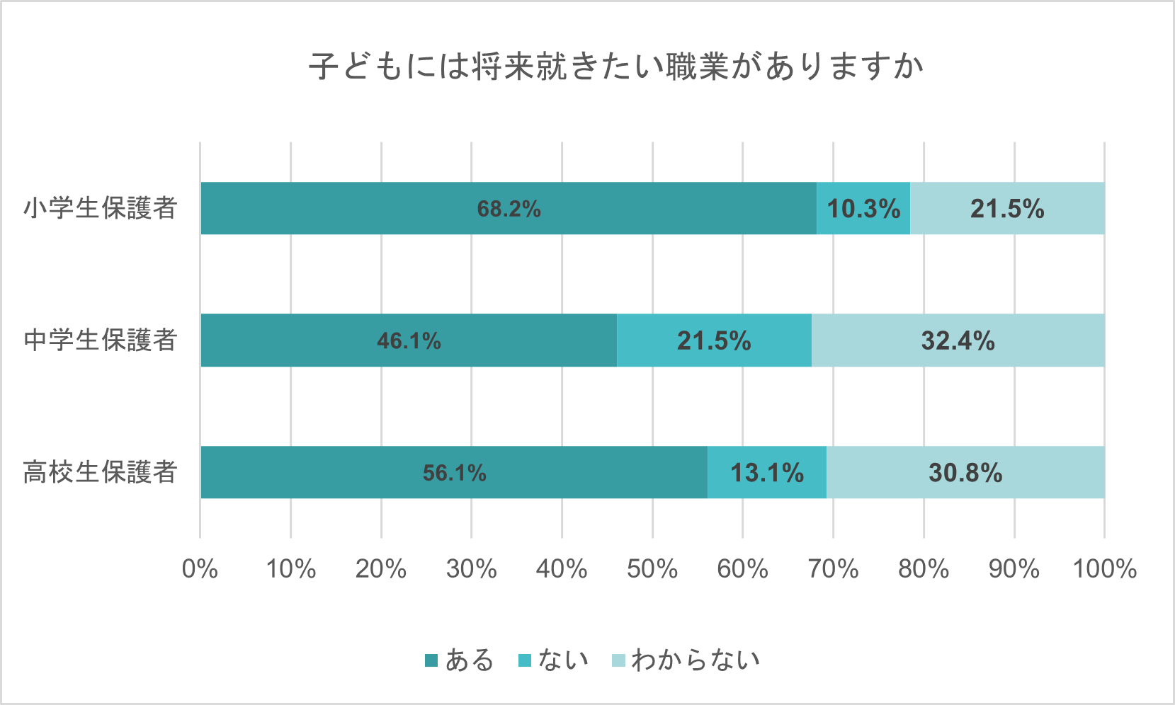 子どもには将来就きたい職業があるかを聞いたところ、小学生保護者の68.2%、中学生保護者の46.1%、高校生保護者の56.1%が「ある」と回答した。