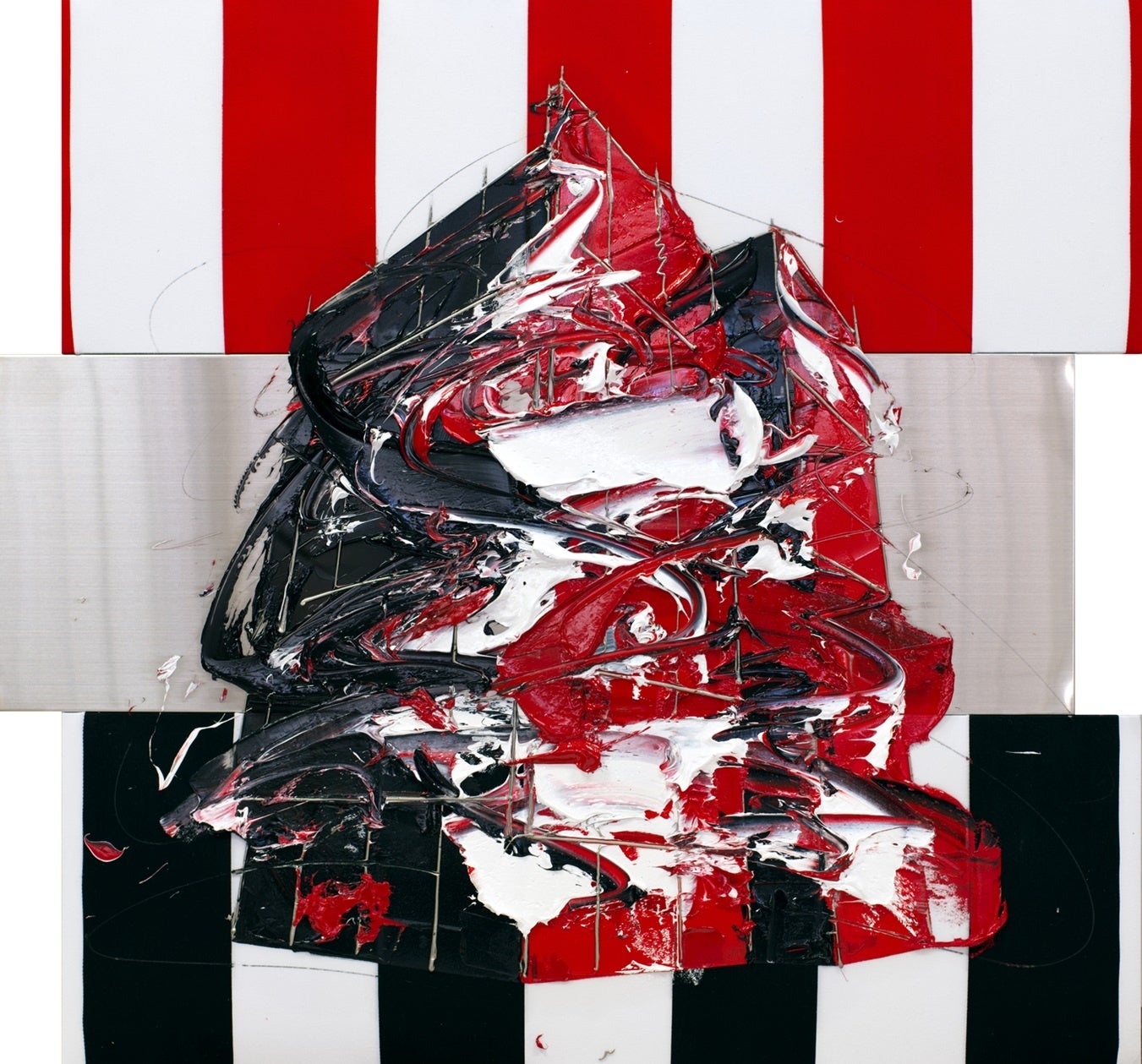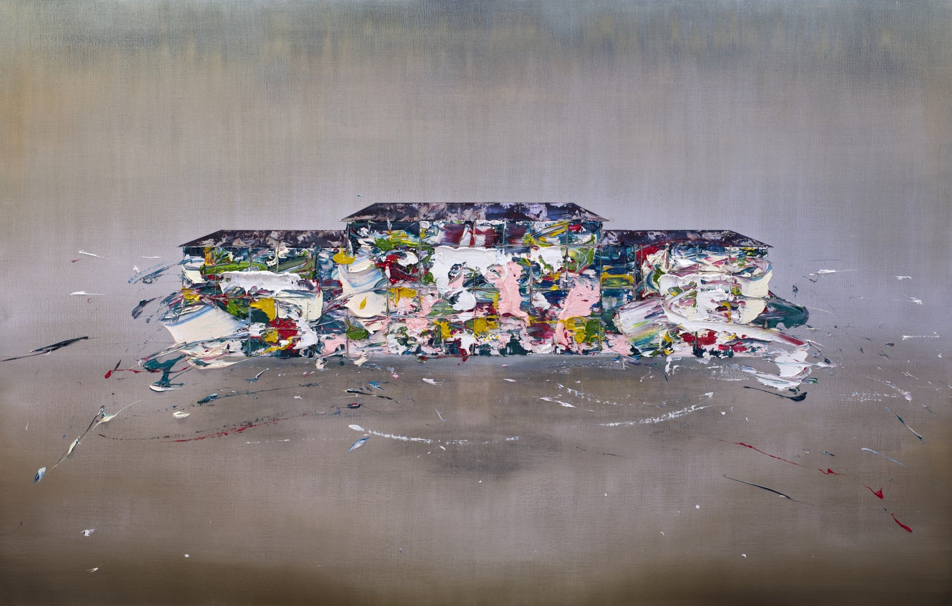 近年は建築中、或いは解体中(改修中)の仮囲いで覆われた建物や構造物をモチーフとして、それを覆うシートをキャンバスに見立て、油彩による抽象表現による作品を制作してきました。