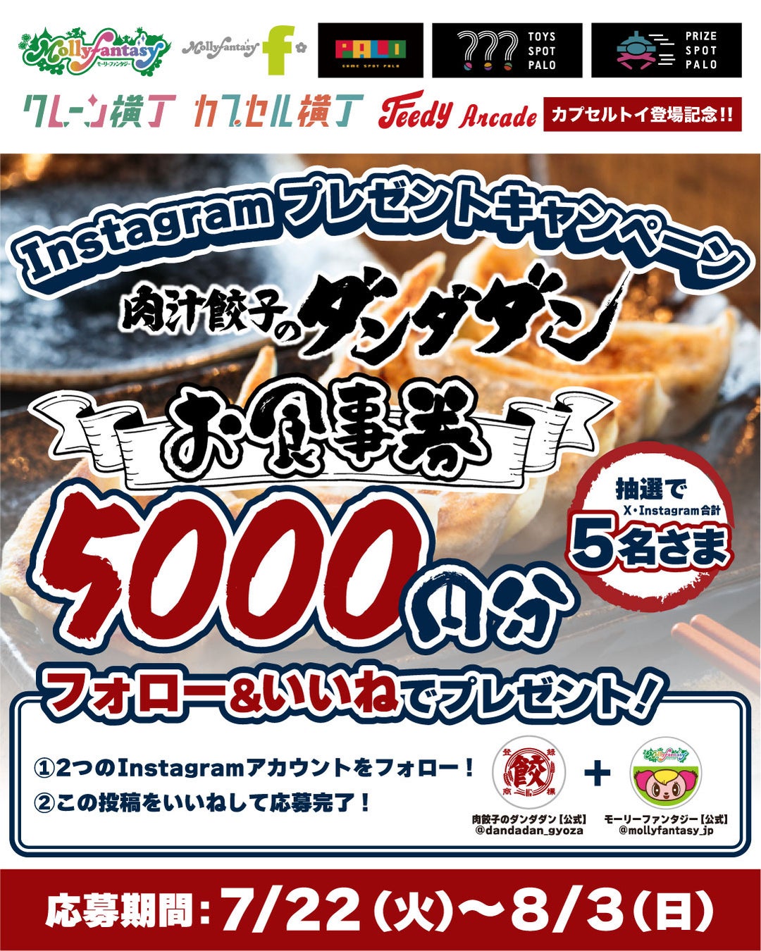 モーリーファンタジー公式X・Instagram、肉汁餃子のダンダダン公式X・Instagramの指定ポストをリポスト、またはいいねをしていただいた方の中から抽選で各5名さまに、「お食事券5,000円分」をプレゼントいたします。詳細は公式アカウントをご確認ください。