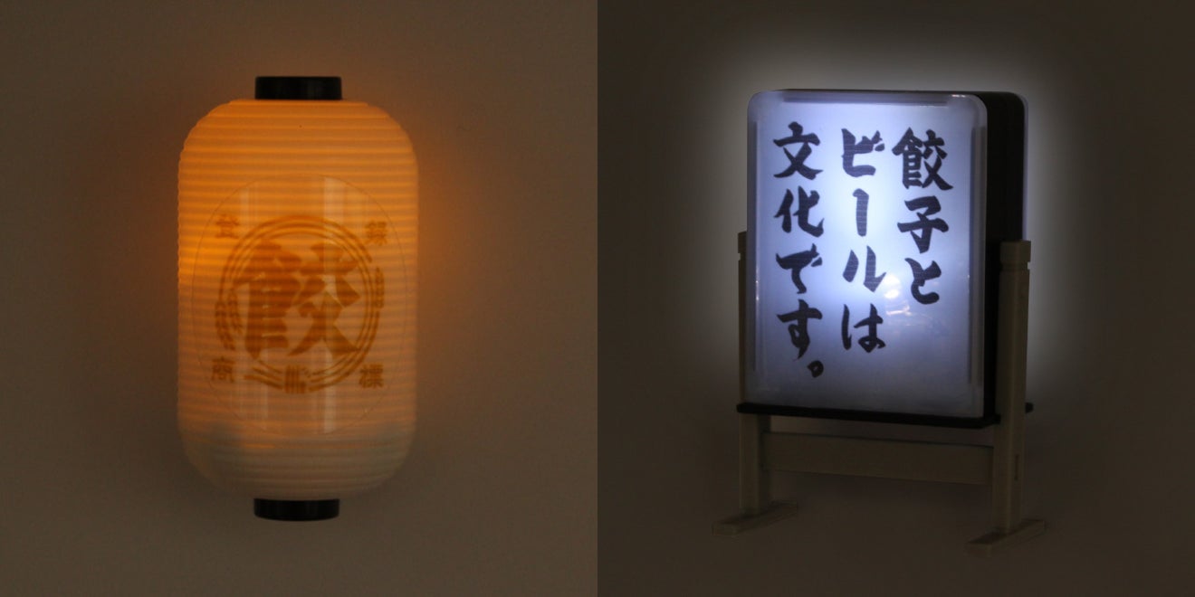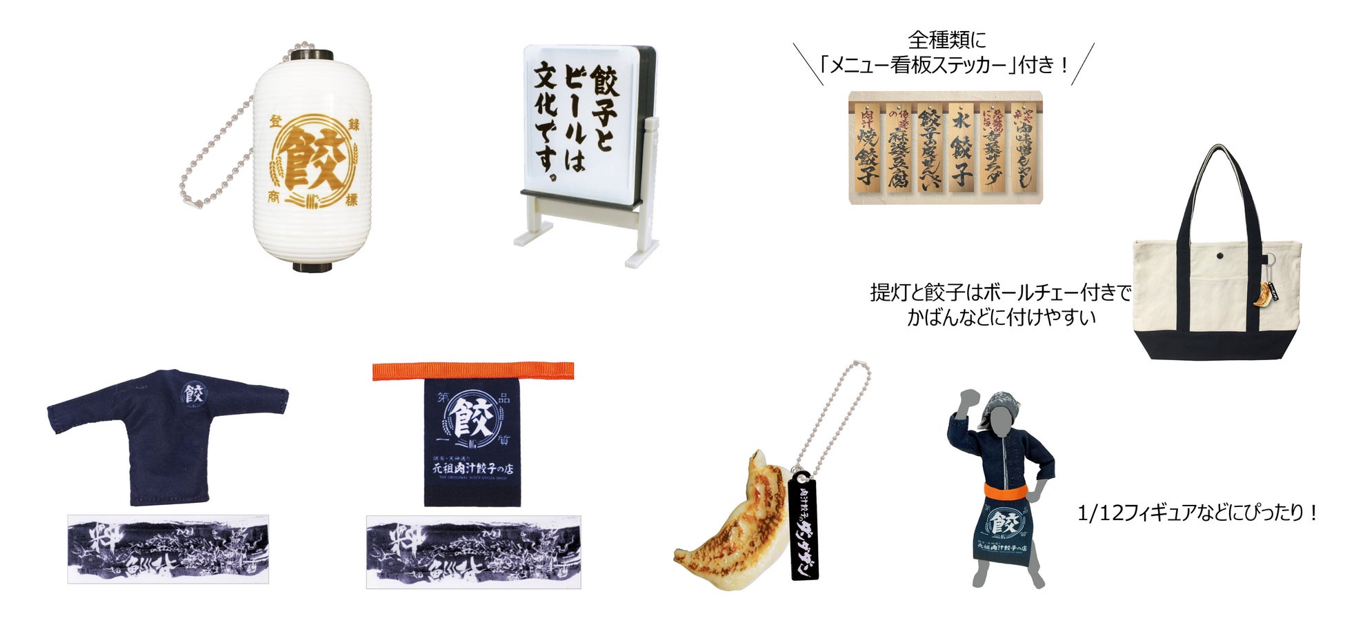 「光る!ミニ看板マスコット」、「光る!ミニ提灯マスコット」、「ミニはちまきミニダボシャツ」、「ミニはちまきミニサロン」、「肉汁餃子マスコットロゴプレート」全5種類。