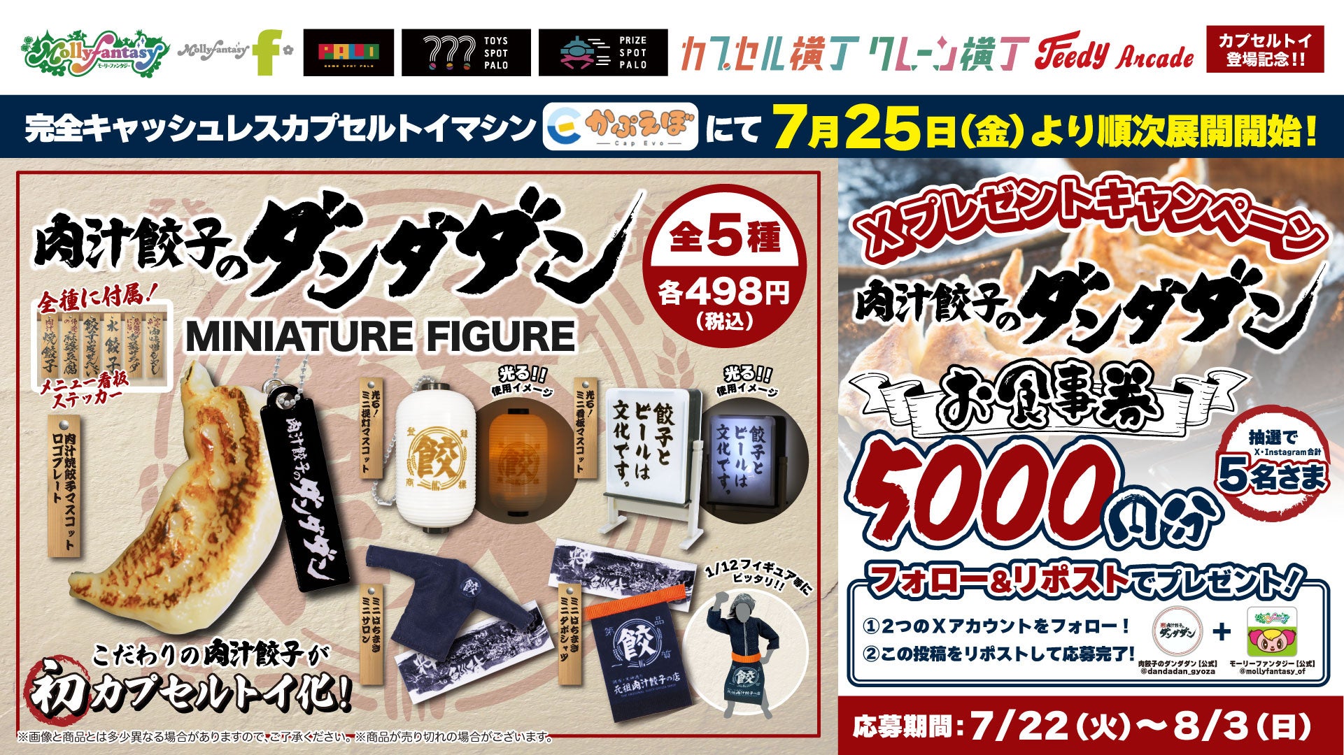 株式会社イオンファンタジー(本社:千葉県千葉市、代表取締役社長:藤原徳也、以下、当社)は、『肉汁餃子のダンダダン』のユニークなカプセルトイ「肉汁餃子のダンダダン ミニフィギュア」を、アミューズメント施設「モーリーファンタジー」「PALO」、カプセルトイ専門店「TOYS SPOT PALO」「カプセル横丁」などに設置する当社オリジナル完全キャッシュレスカプセルトイマシン「かぷえぼ」限定カプセルトイとして7月25日(金)より順次展開いたします。