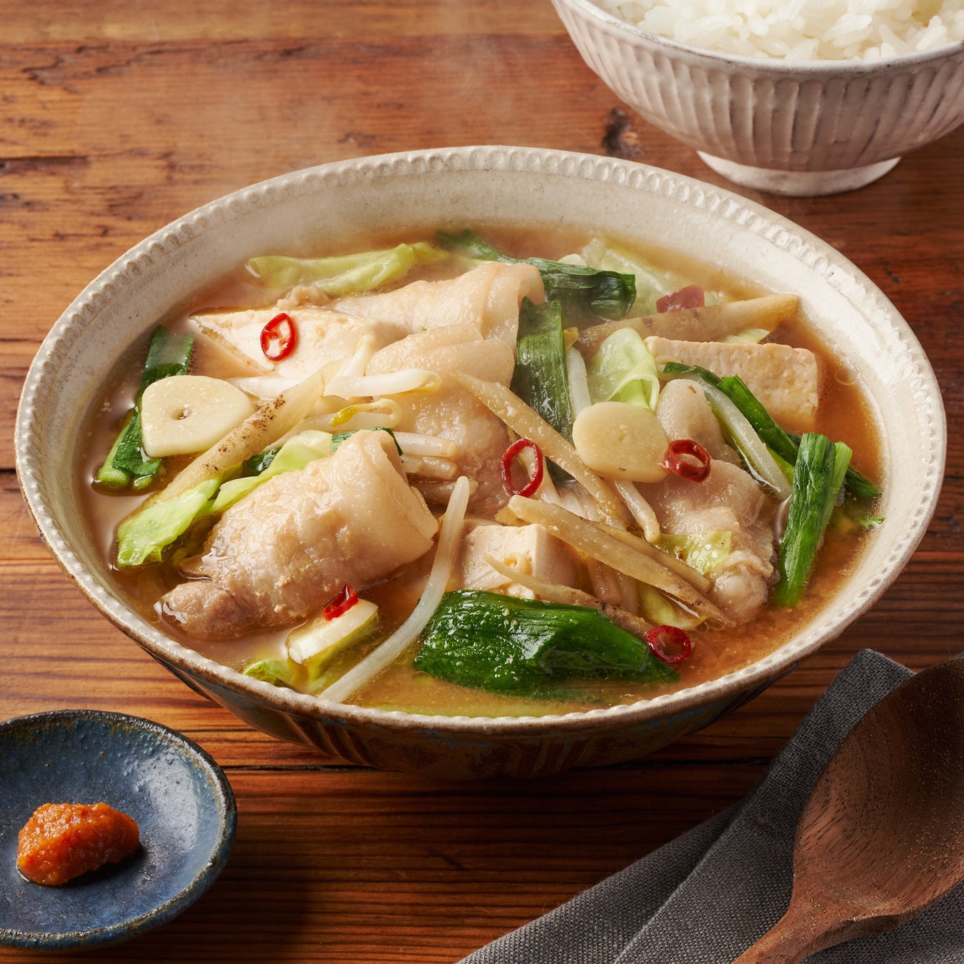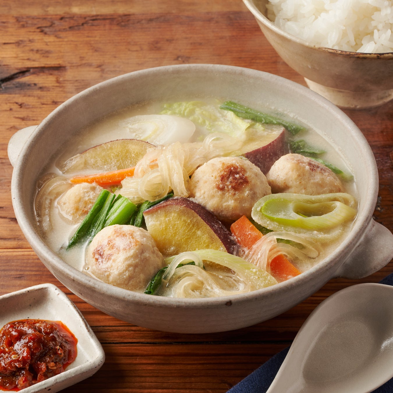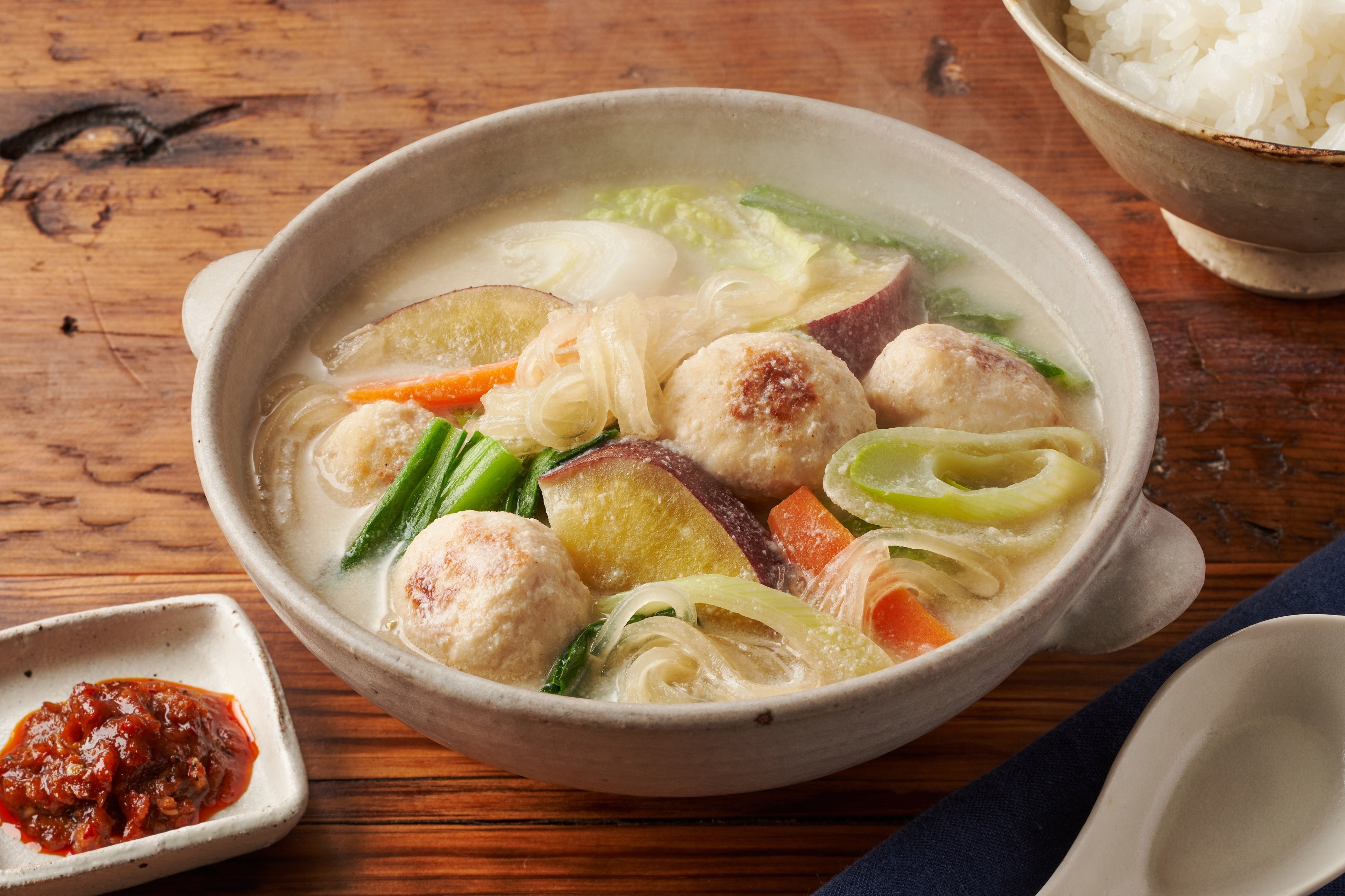 ふわふわの鶏団子とたっぷりの野菜、もちもちとした食感の春雨が入った具沢山スープを、豆乳でまろやかに仕上げました。おろししょうがやにんにく、味噌や万能濃縮つゆなど、一緒にお届けする調味料を入れるだけで味が決まるのも嬉しいポイントです。最後に「食べるラー油」をお好み量のせて召し上がれ。