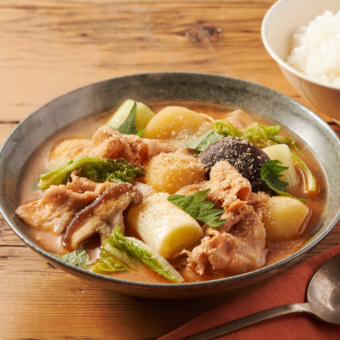 じゃがいもがメインの韓国風煮込みは、合わせ味噌だれがポイントのやみつきになる味わいです。野菜や豚肉の旨みが溶け出して、ごはんとも好相性。ほくほくした食感とあつあつのスープで、身体の芯から温まっていただけます。