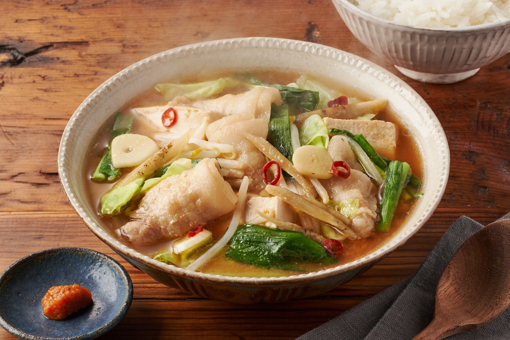 鍋に材料を入れていくだけで味が決まる味噌鍋に、にんにくを合わせたパンチある具だくさんの煮込みです。キャベツやもやしの甘みに、豚バラ肉の旨みが加わり、ごはんがすすむおいしさです。食べ進める途中で、発酵調味料の「かんずり」とゆずペーストを合わせたたれを加えると、爽やかな辛みも味わっていただけます。