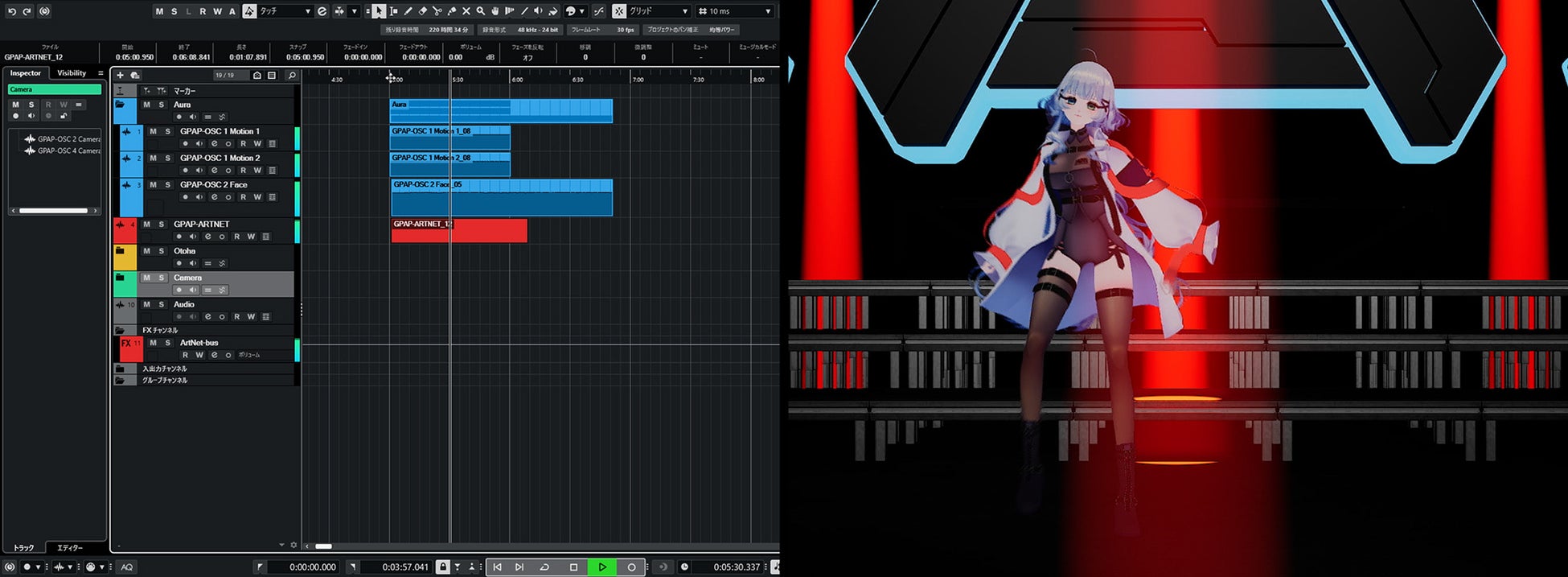 「GPAP」は、音声・映像・照明などのさまざまなデータをオーディオデータ(wavデータ)として記録・再生・編集することを可能にする技術です。「n-Links Retarget」は、モーションキャプチャーのデータをOSC(Open Sound Control)形式(※3)で送出するバーチャルプロダクションの支援システムです。リターゲット処理(※4)をはじめ、より高い安定性と柔軟性を実現しています。