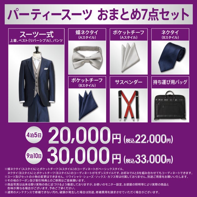 この度、お客様からのご要望を受け、新たにパーティー向けタキシード調スーツをラインナップに追加いたします。タキシード調スーツのため、結婚式での新郎ご本人様・参列者様はもちろん、その他パーティー等でご利用いただくことが可能です。カラー展開は、ネイビー・グレー・ワイン・ブラウン・ベージュ・白をご用意しております。レンタルセットは、スリーピーススーツ一式(ベストはリバーシブル仕様)に加え、「ベーシックスタイル」「モダンスタイル」の2パターンの着こなしができるようネクタイは蝶ネクタイ・結び下げネクタイの2点をご用意。およびそれぞれのネクタイに合う色のポケットチーフ2点とその他アイテムの計7点でお届けいたします。