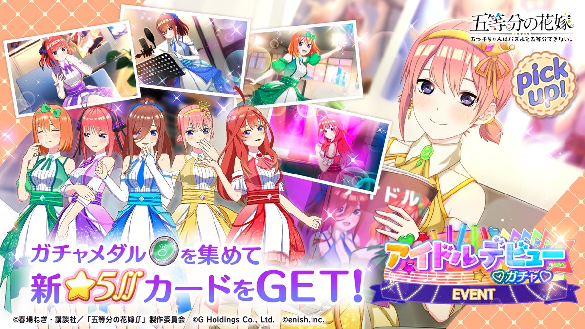 株式会社enish(本社:東京都港区、代表取締役社長:安徳 孝平、以下enish)は、2025年3月7日(金)より、アニメ「五等分の花嫁」初となるゲームアプリ『五等分の花嫁 五つ子ちゃんはパズルを五等分できない。』にて、週刊少年マガジン編集部完全監修のゲームオリジナルストーリーをお楽しみいただける新イベント「五つ子ちゃんはアイドル!?~ゴーゴーデビューコンサート~」を開催いたします。