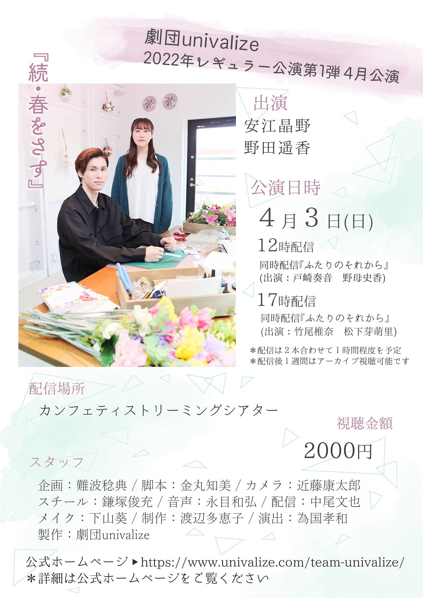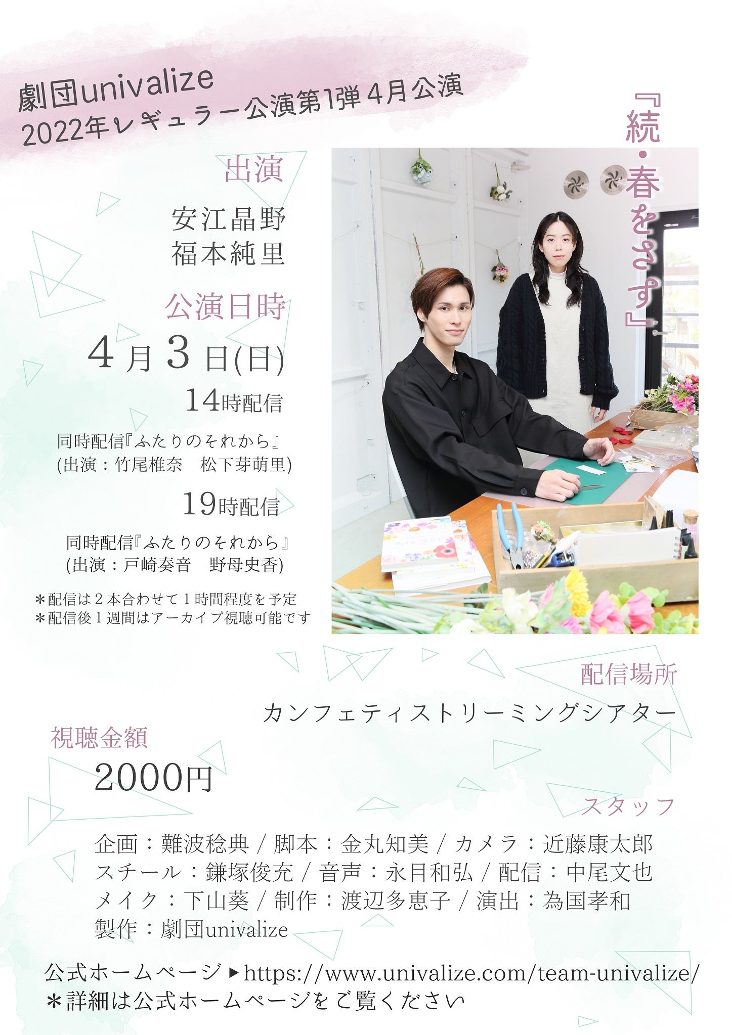 合同会社univalize(東京都中野区)主催、「劇団univalize 2022年レギュラー公演 第一弾 4月配信分 『ふたりのそれから』&『続 春をさす』」が2022年4月3日(日)12:00~4月10日(日)23:59までConfetti Streaming Theaterでアーカイブ配信されます。チケットはカンフェティ(運営:ロングランプランニング株式会社、東京都新宿区、代表取締役:榑松 ⼤剛)にて発売中です。