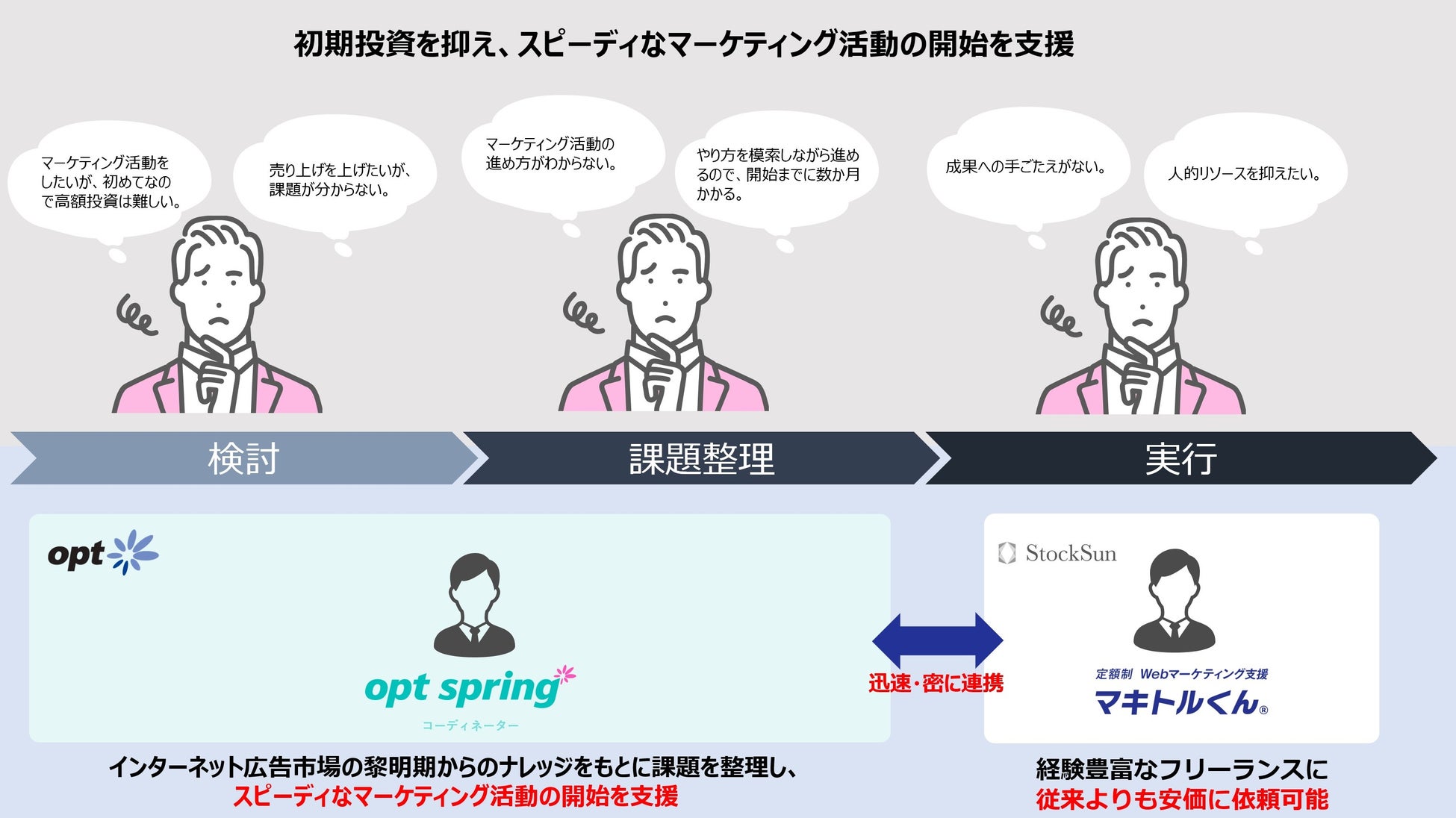 本連携は、オプトが「opt springⓇ (オプト・スプリング)」にて提供している、経験豊富なマーケターがマーケティングのアドバイスを行う情報支援サービスと、StockSunが「マキトルくんⓇ」にて提供しているWebマーケティング実行支援サービスを掛け合わせ、初期投資を抑え、スピーディにマーケティング活動の外注を開始したい企業さまへマーケティング支援を行うサービスです。
