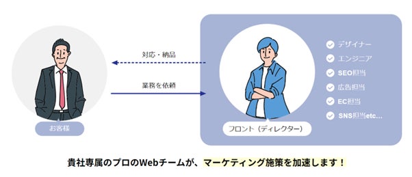 経験豊富なフリーランスに、月額定額制でWebマーケティング業務を依頼できるサービスです。月額5万円からサイト運用保守、Web制作、Web広告運用、SEO、SNS運用などのWeb業務を幅広くご依頼いただくことが可能です。