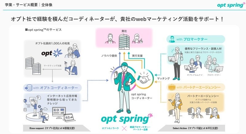 昨今、急速にデジタル化が進み、95%以上の企業がデジタルマーケティングの重要性を感じているという調査結果(※2)がでているなかで、大手広告代理店の支援は日本全体の企業数約337万社のうち、約0.3%(※3)である約1万社の大企業に集中しがちであり、一定規模の予算が確保できない企業は望んだ支援を受けることが難しいというマーケティング市場の需給不均衡が生まれています。このような課題を解決するため、オプトでは本年4月より、アルムナイやフリーランス、パートナーエージェンシーとのオプトコミュニティを活かして顧客企業の事業成長を支援する「opt springⓇ(オプト・スプリング)」の提供を開始いたしました。