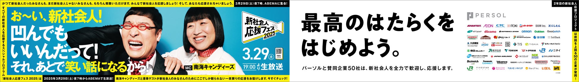 「はたらいて、笑おう。」をグループビジョンに掲げるパーソルホールディングス株式会社(本社:東京都港区、代表取締役社長 CEO:和田 孝雄、以下パーソルグループ)は、4月を目前にはたらきはじめの不安を抱く新社会人に寄り添い、新たな一歩を踏み出すことができるよう応援する「新社会人応援プロジェクト」を実施します。そしてこの度、「さまざまな“はたらく”の選択肢の中から、入社や起業など自分の指針を自ら決めた新社会人を応援し歓迎したい」という想いのもと、50の企業によるプロジェクトへの賛同が決定いたしました。