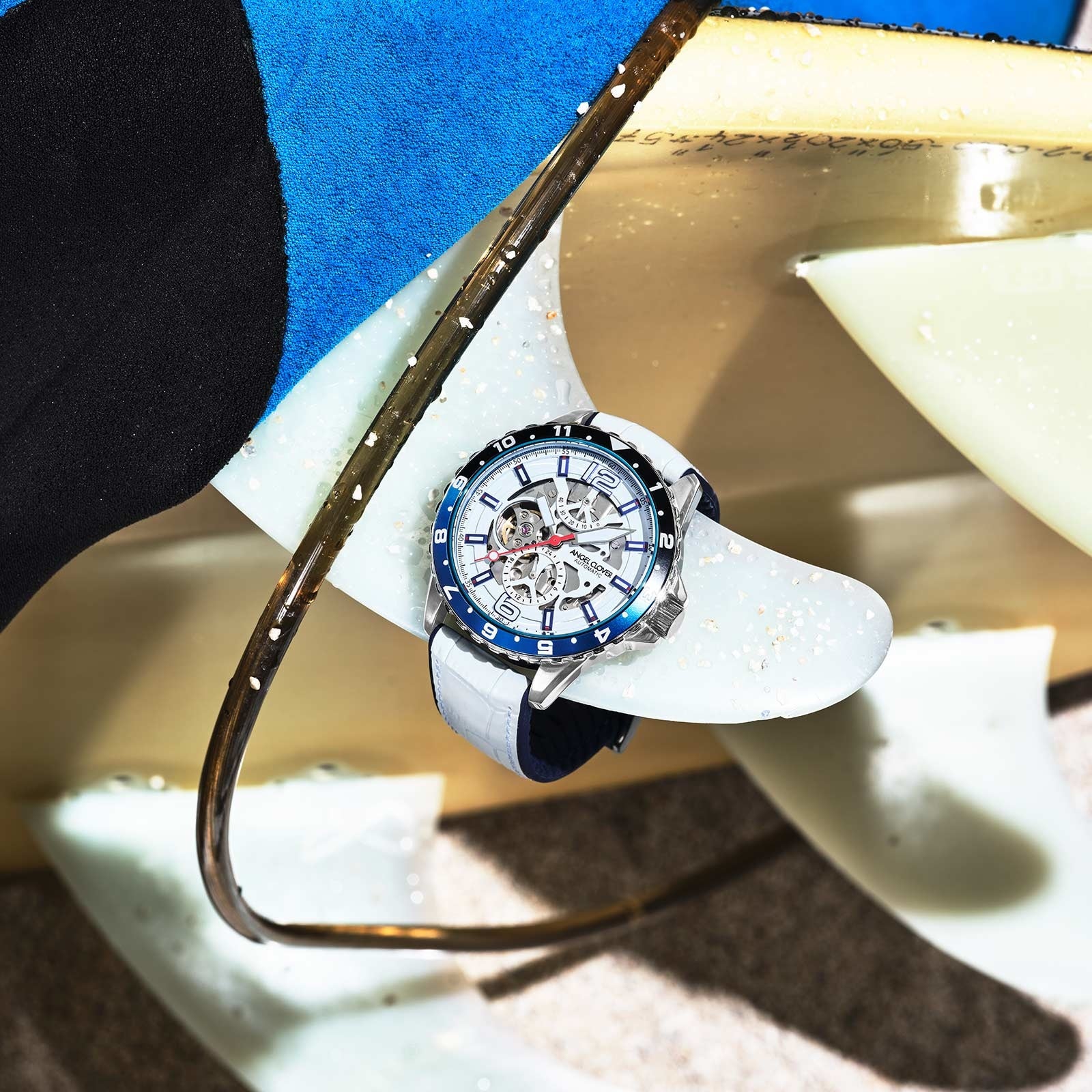 「TIME CRAFT DIVER AUTOMATIC」は、「機械式時計」×「アウトドア」×「ダイバーズ」 、腕時計のトレンドをバランスよくミックスしたコレクションです。目を奪うスケルトン仕様のダイヤルでありながら、20気圧防水を備え、日常生活レベルの汗や水濡れに対応できる、レザーとラバーを圧着させたハイブリッドベルトを採用したタフな仕様を実現しました。
