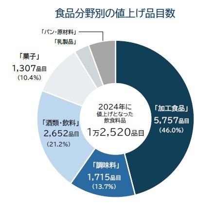 主要な食品メーカー195社における、家庭用を中心とした2024年の飲食料品値上げは累計で1万2520品目を数えた。年初に想定した1万品目の水準を上回ったものの、バブル崩壊以後の過去30年間でも例を見ない記録的な値上げラッシュとなった23年の3万2396品目に比べて約6割減少した。22~23年にかけて続いた、月間2千品目超の水準が常態化した「値上げラッシュ」は抑制された1年となった。