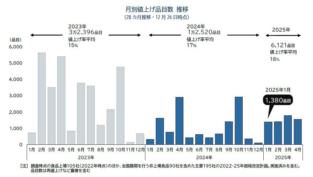 2025年1月から4月までに値上げが決定している飲食料品は、パンのほかビールなど酒類・飲料、冷凍食品など6121品目が判明した。このうち、25年1月はパン類を中心に1380品目を数え、1月としては調査を開始した22年以降で最多となった。また、23年7~10月以来、約1年3カ月ぶりに4カ月連続で単月あたり1千品目を超えた。このほか、23年12月時点で判明した翌年(24年)の値上げ予定品目数が3891品目だったのに対し、25年の値上げ品目数は約6割の増加となり、25年春にかけて24年を上回る値上げラッシュが常態化する見通しとなる。