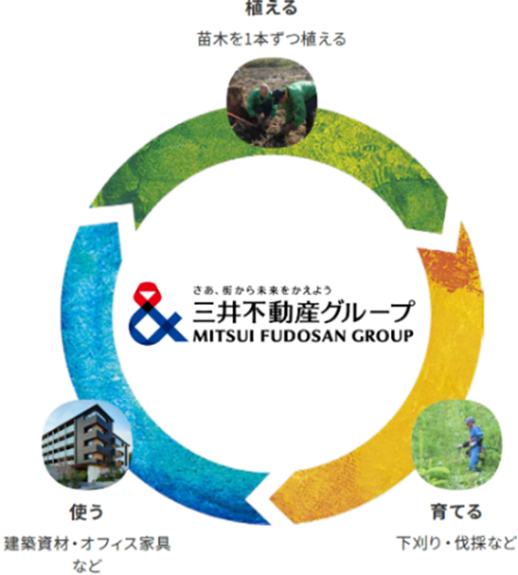 三井不動産グループは、グループビジョンに「&EARTH」を掲げ、社会・経済の発展と地球環境の保全に貢献しています。この保全活動の一環として、北海道に約5,000haの森林を保有しており、「植える→育てる→使う」のサイクルをまわし続けながら、持続可能な森林循環への貢献を目指し “終わらない森”創り※1に取り組んでいます。