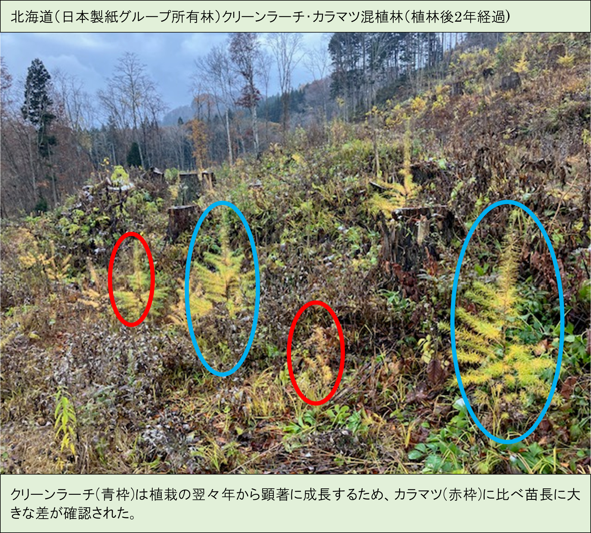 日本製紙グループは「木とともに未来を拓く総合バイオマス企業」として健全な林業の再生を支援することで、原材料の安定調達と国産材流通事業の拡大を図っており、この一環としてクリーンラーチを始めとしたエリートツリー苗の普及に取組んでいます。