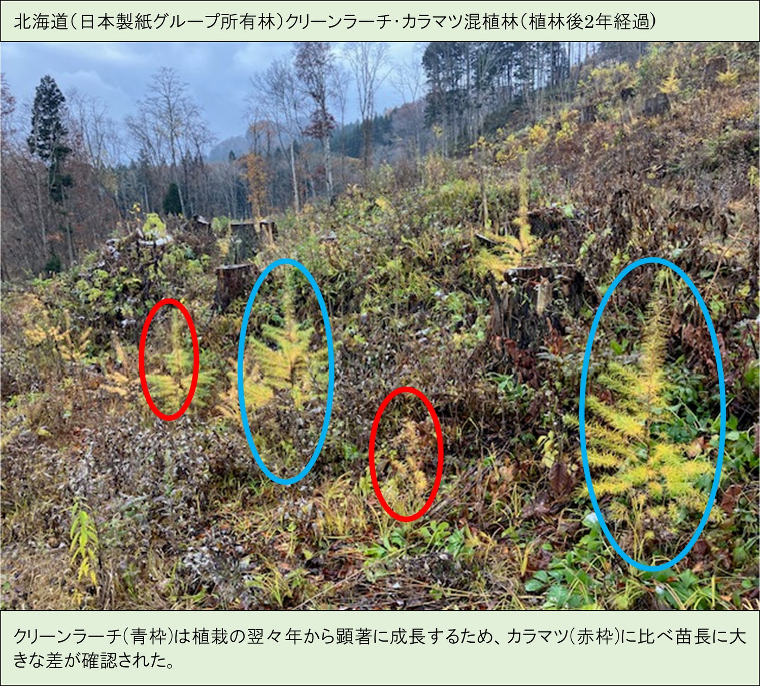 クリーンラーチは、グイマツ精英樹を母親、カラマツを父親として、地方独立行政法人 北海道立総合研究機構によって新しく開発された種間雑種です。CO2を固定する能力が普通のカラマツより7~20%高いことに加えて、成長速度が比較的早く、育成過程で発生する下草刈りの回数が減るなどの特徴を持っています。