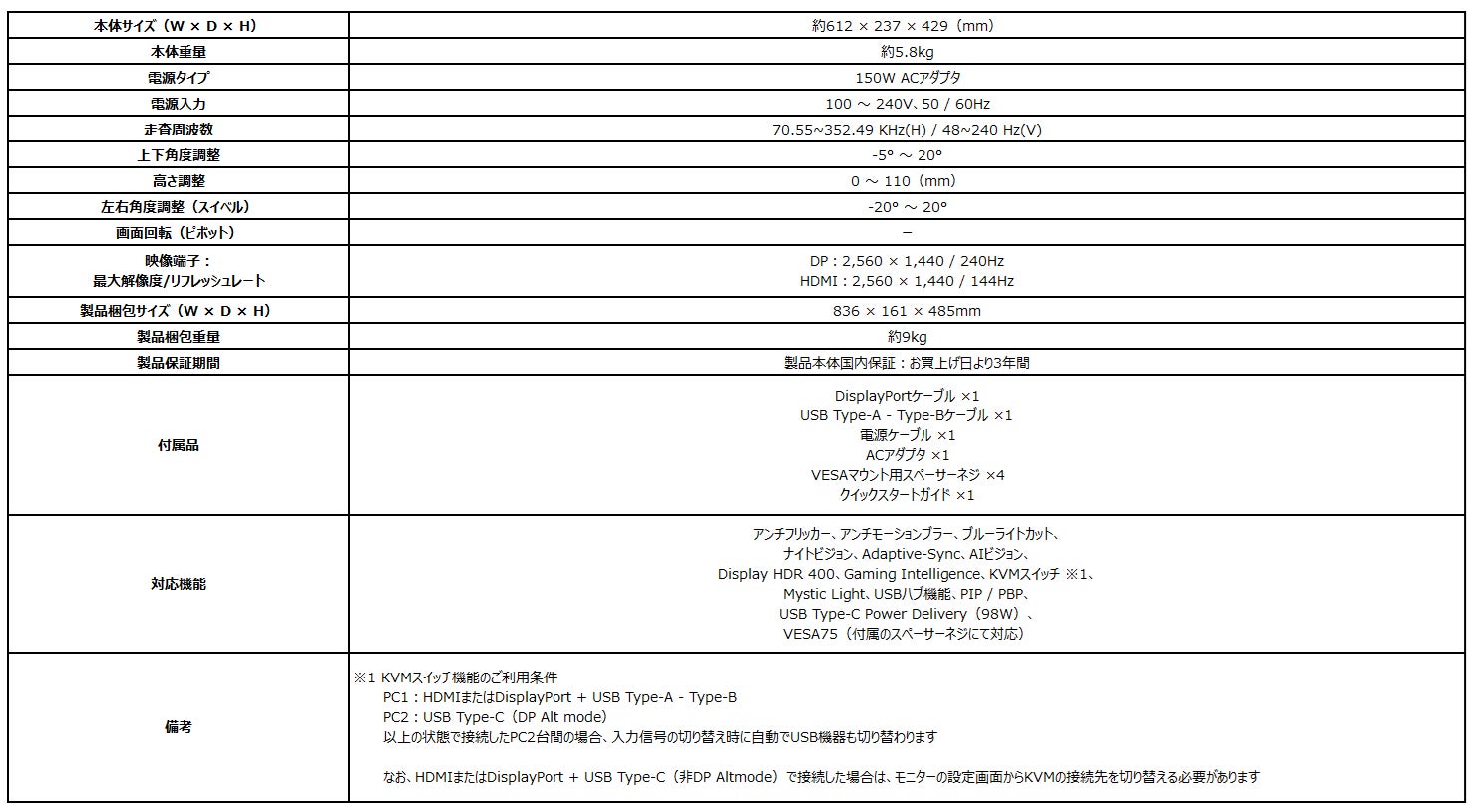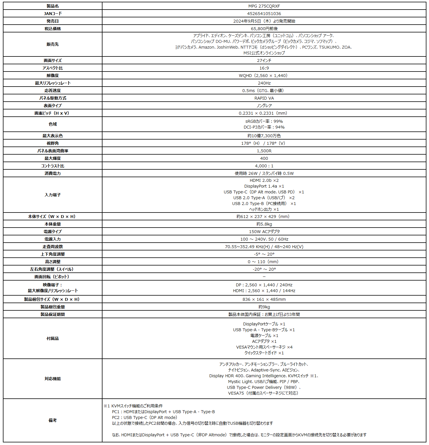 27インチ・WQHD・240Hz・0.5ms(GTG)対応ゲーミングモニター KVMスイッチ・USB PD98W・高性能スタンドも備えたハイスペックモデル「MPG 275CQRXF」発売