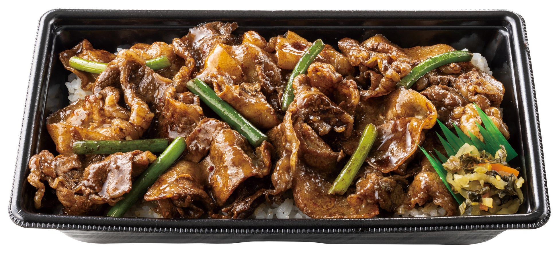 『黒の牛豚ダブル焼肉重』は、牛と豚、両方のお肉を使用した贅沢な肉メニューです。タレは醤油をベースに、おろしにんにく、コチュジャン、リンゴ果汁や、味の決め手となる、焦がし醤油と黒マー油を加えた甘辛なコク旨ダレに仕上げました。にんにくが効いたパンチのあるタレと、牛肉と豚肉の旨みが合わさった、ごはんが止まらない美味しさです。付属のマヨネーズ小袋で、より背徳感のある美味しさとなり、味変としても楽しめます。セパレートタイプの『黒の牛豚ダブル焼肉弁当』も登場します。