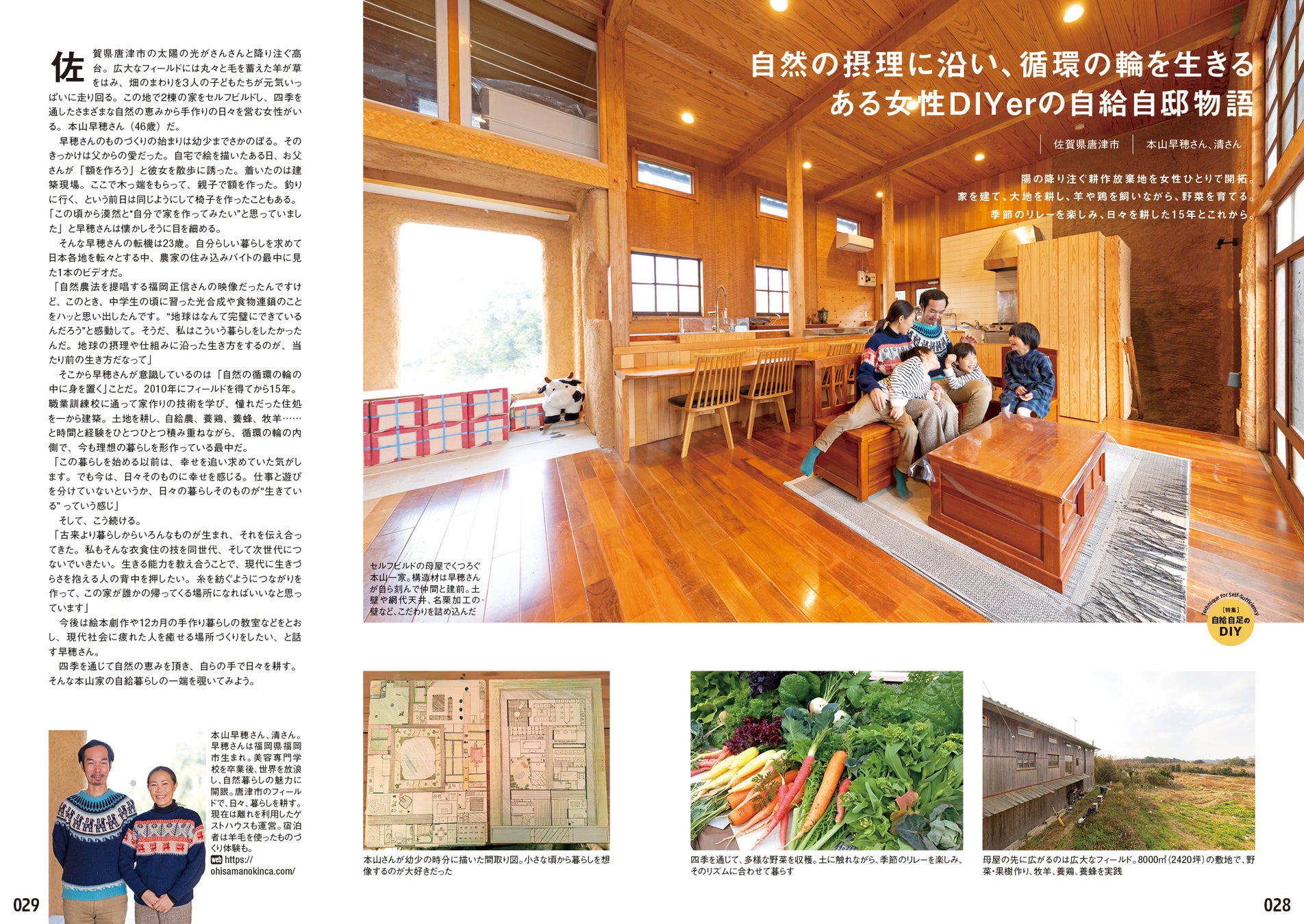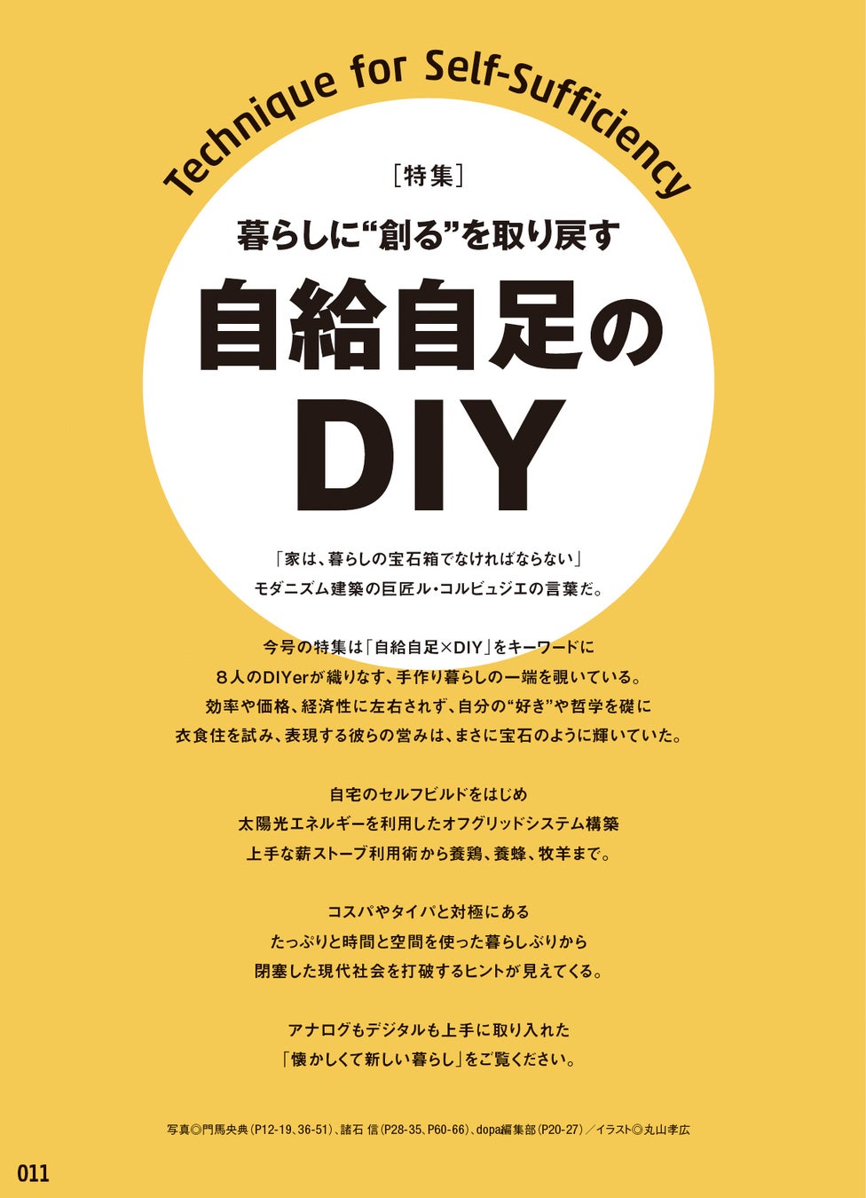 特集は「自給自足のDIY」。自宅のセルフビルドをはじめ、太陽光発電を利用したオフグリッドシステム構築、薪ストーブ利用術から養鶏、養蜂、牧羊まで。衣・食・住・エネを手作りで生み出す、快適自給術を公開!