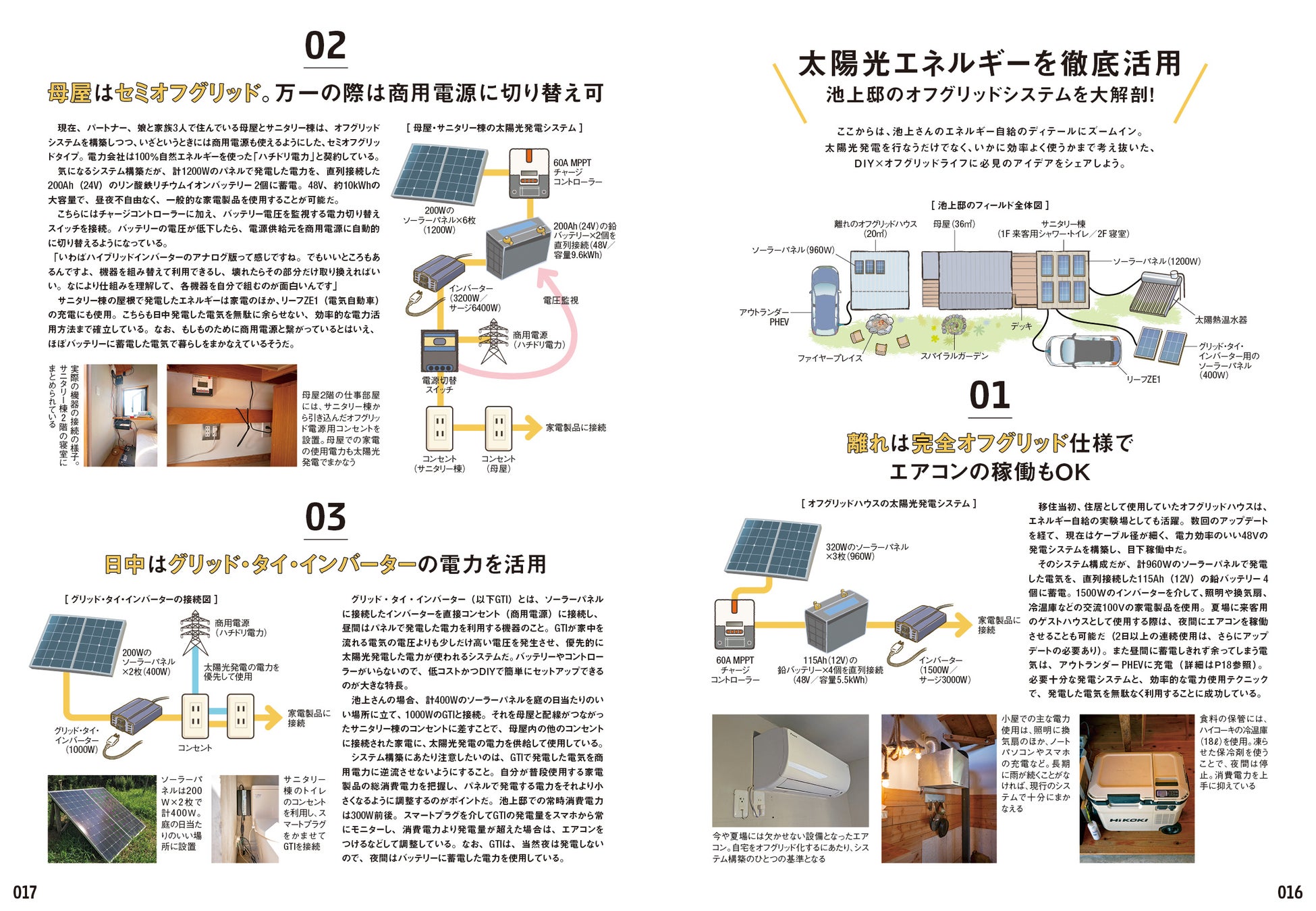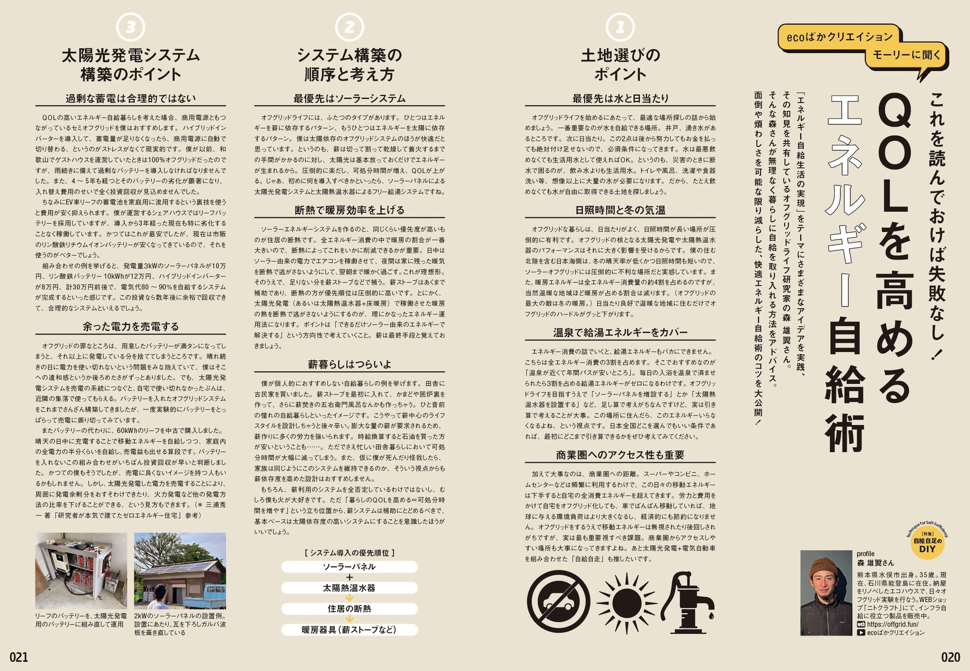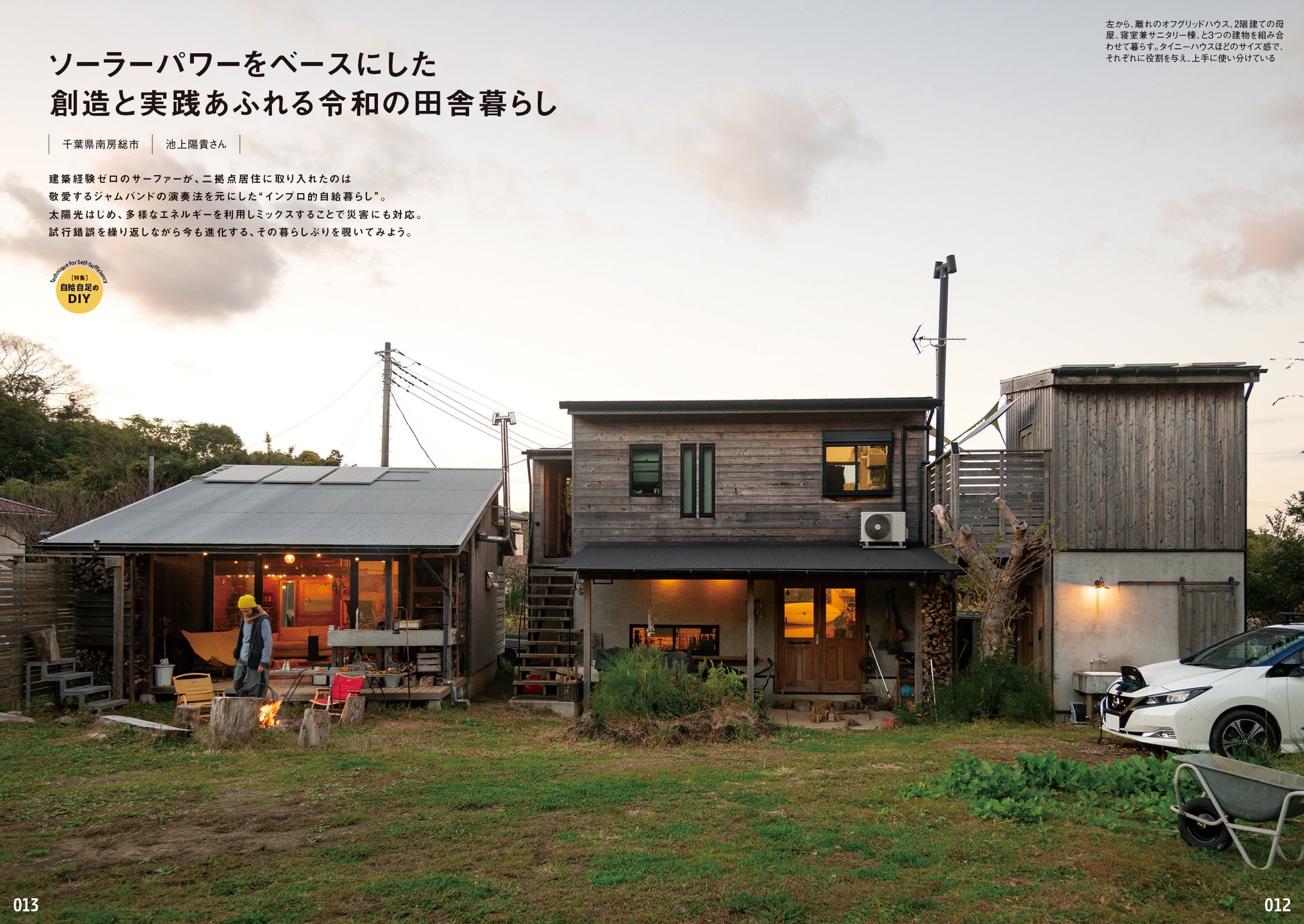 自給自足特集の冒頭を飾るのは、ソーラーエネルギー自給システムを構築したふたりのDIYerの暮らしだ。彼らは太陽光発電と太陽熱温水器を組み合わせたオフグリッドシステムをDIYで構築。この発電システムに電気自動車を組み合わせることで、自宅の消費電力から移動エネルギーまでをカバー。そのノウハウを詳しく紹介する。その他、「ecoばかクリエイションモーリー」こと森 雄翼さんが語る“QOLを高めるためのエネルギー自給術”は必見! 面倒やわずらわしさゼロの自給アイデア指南に、目からウロコが落ちるはず。