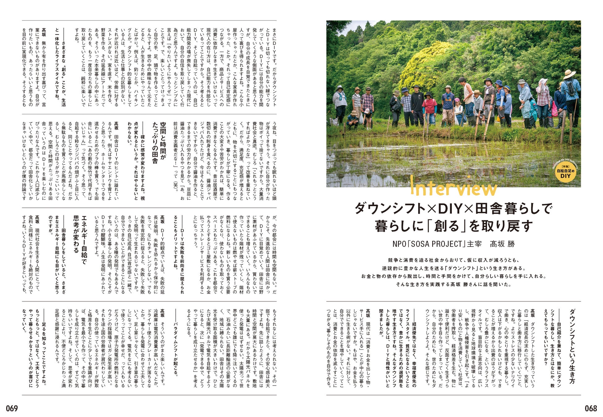 DIY・田舎暮らし・アウトドア書籍を多数執筆する西野弘章さんが、長年の自給自足暮らしから生み出したテクニック&アイデアを、エネ・食・住、3つのジャンルに分けて一挙紹介。また千葉県匝瑳市で「ダウンシフトな暮らし」を実践する髙坂勝さんの7000字インタビューも掲載。暮らしに自給、働き方にDIYを取り入れ、消費とお金の依存から脱出した生き方の豊かさを語る。