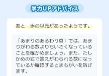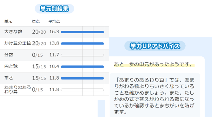 全国順位や位置が分かるだけではなく、全国の結果を元に、教科ごと、さらには単元ごとに自分の得意・苦手が客観的に把握できます。苦手な単元については、今後どのように学習を進めればいいのか、個別のアドバイスもついてくるので、具体的な学習の進め方もわかります。