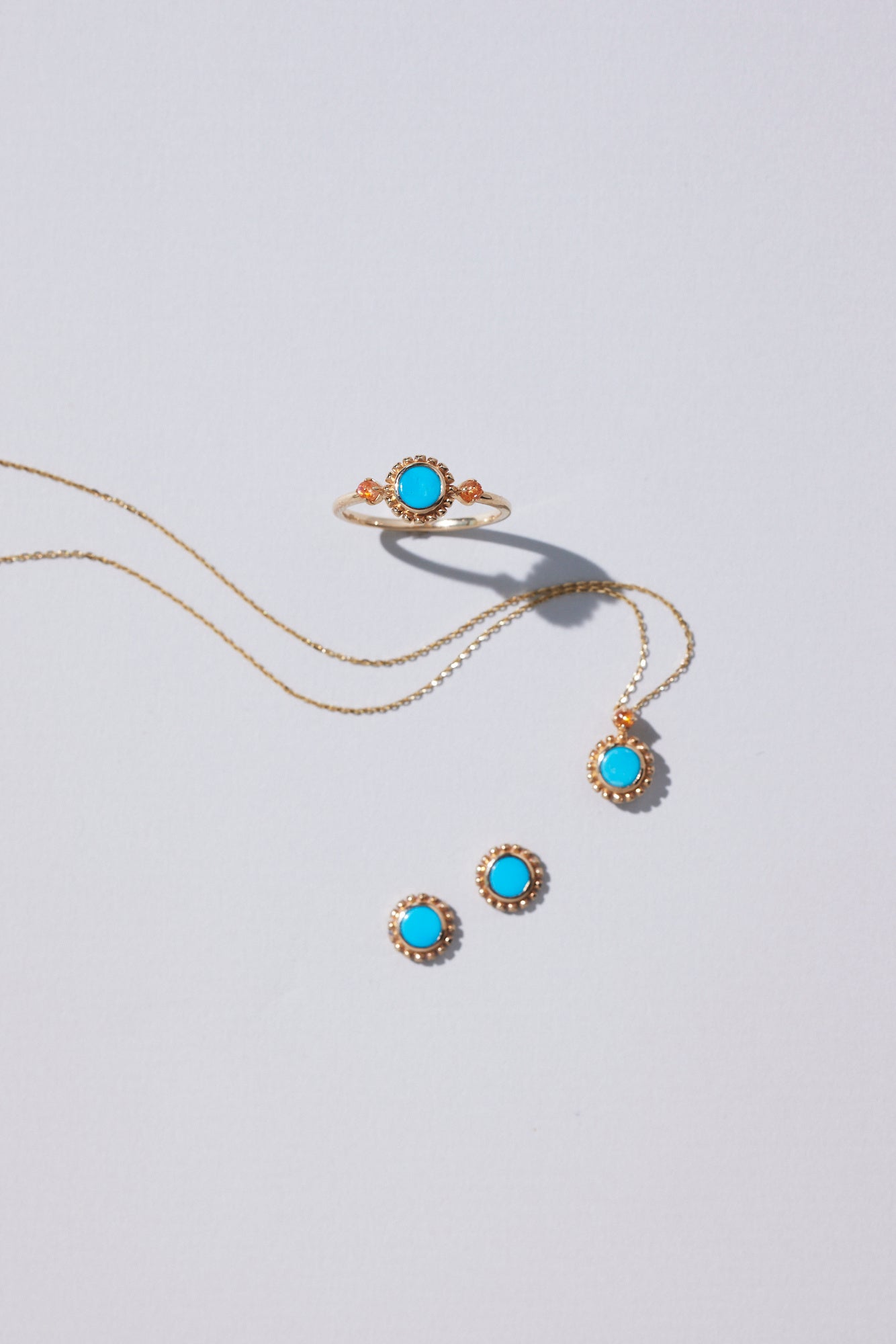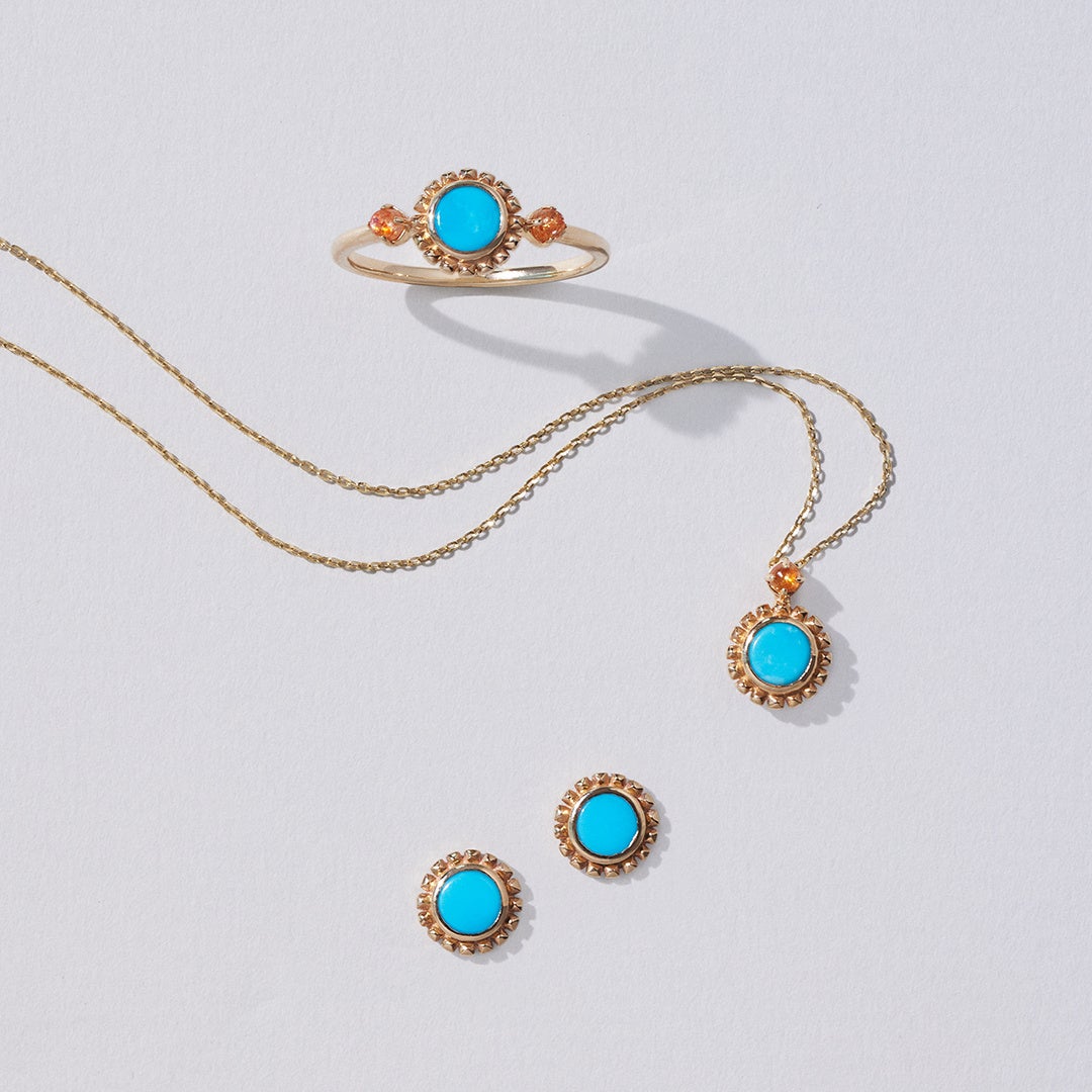 ディスク型にカットしたターコイズの表情が新鮮なジュエリー。サンストーンを添えて、夏にぴったりなビタミンカラーをさりげなく楽しめるアイテム。