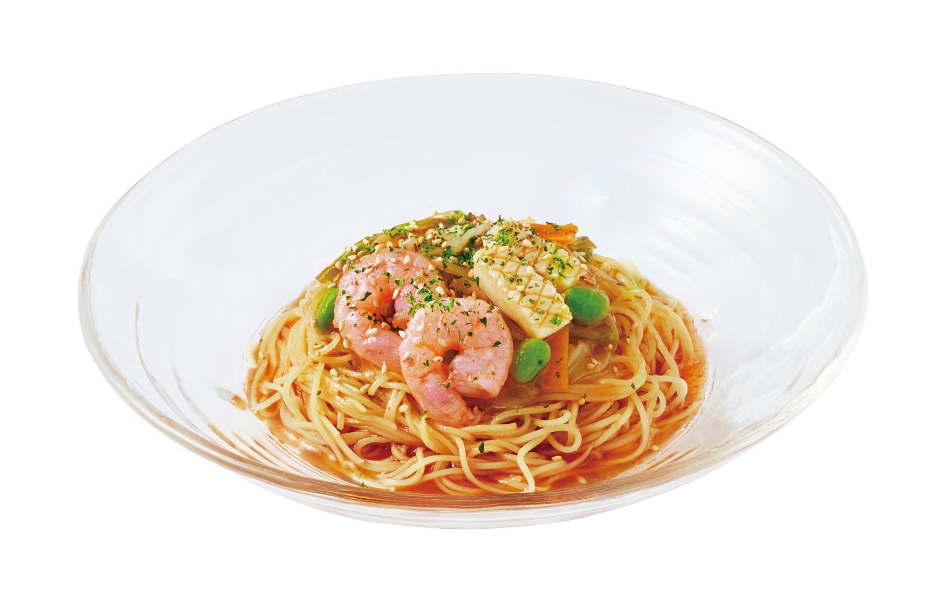 彩り豊かな海老やイカ、キャベツ、人参、もやしをトッピングし、夏らしく完熟トマト使用のピューレとシチリア産レモンの果汁をブレンドしたあっさり塩スープに、風味豊かなオリーブオイルを加えた洋風仕立ての涼風麺です。