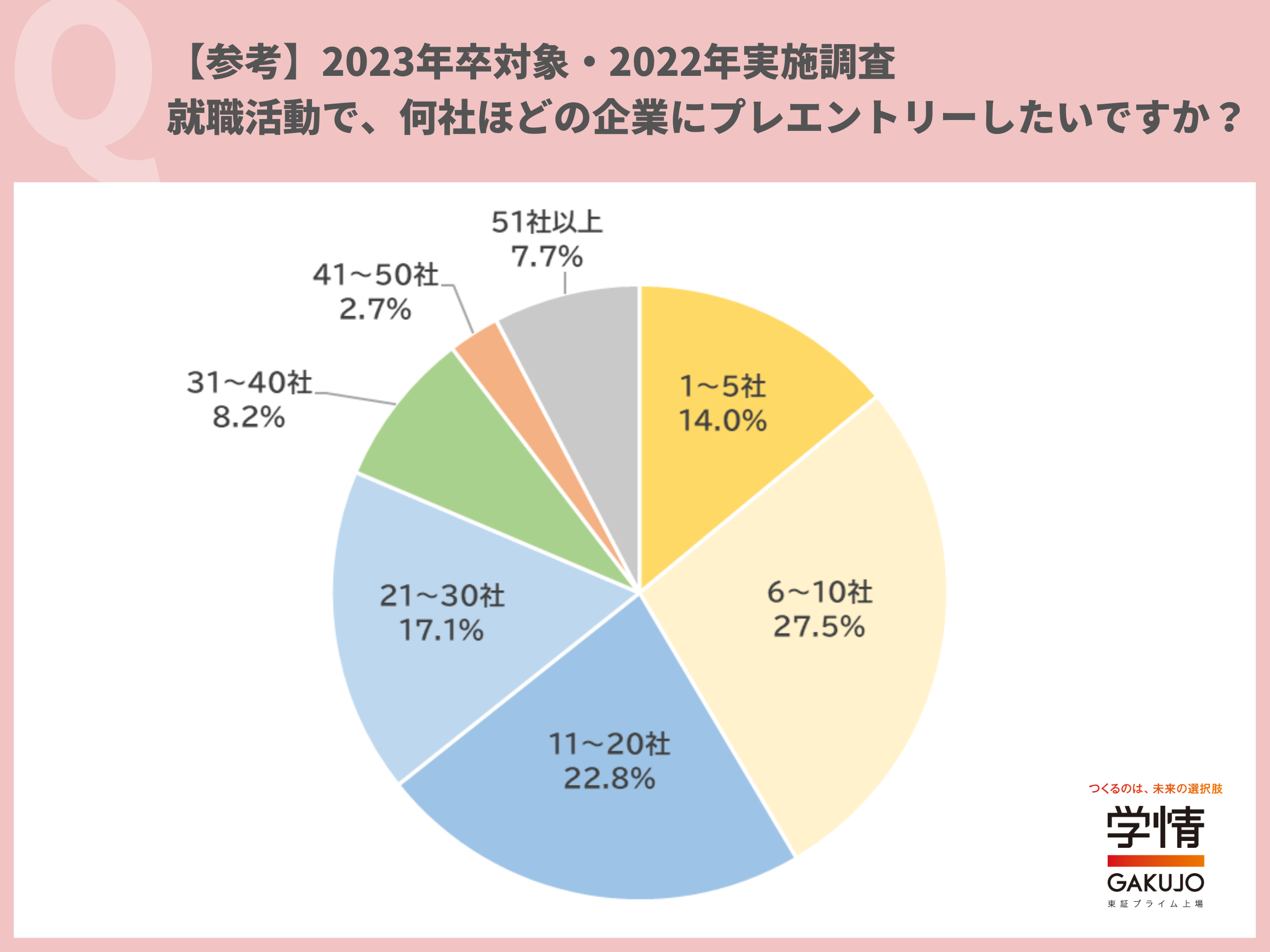 プレエントリーを予定している企業数は、「10社以下」が半数に迫る。「既に数社に絞っている」「志望度の高い企業の選考に力を入れたい」「1社1社丁寧に選考を受けたい」の声/2024年卒対象アンケート