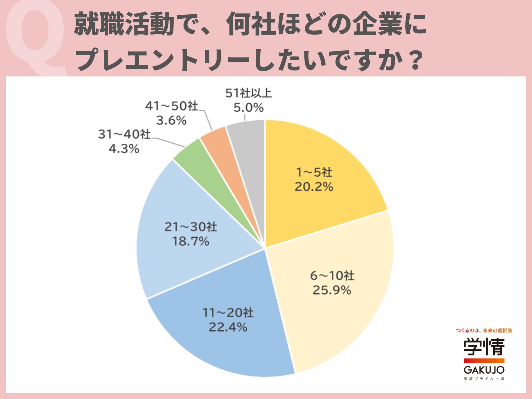 株式会社学情(本社:東京都千代田区)は、2024年3月卒業(修了)予定の大学生・大学院生を対象に、インターネットアンケートを実施。今回は、「プレエントリー・選考参加」に関して調査しました。就職活動でプレエントリーを予定している企業数について、「6~10社」が25.9%で最多。「1~5社」20.2%を合わせると、「10社以下」の回答が46.1%に上ります。「10社程度まで、プレエントリーしたい企業を既に絞っている」「志望度の高い企業の選考に力を入れたい」「選択肢が多すぎると選択できないので、ある程度絞り込んで1社1社の選考を丁寧に受けたい」といった声が上がりました。前年調査(2023年卒対象)と比較すると、「5社以下」の回答は6.2ポイント、「10社以下」の回答は4.6ポイント上昇しており、プレエントリーする企業や選考に参加する企業を絞り込む傾向はより顕著になっていることが分かります。