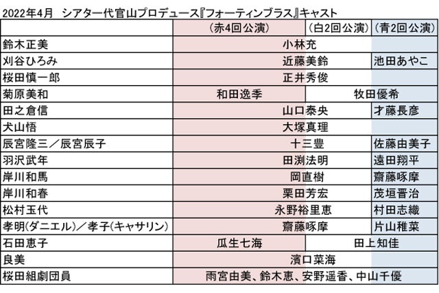 青:小林充、池田あやこ、正井秀俊、牧田優希、才藤長彦、大塚真理、佐藤由美子、遠田翔平、齋藤啄摩、茂垣晋治、村田志織、片山稚菜、田上知佳、濱口菜海、雨宮由美、鈴木恵、安野遥香、中山千優