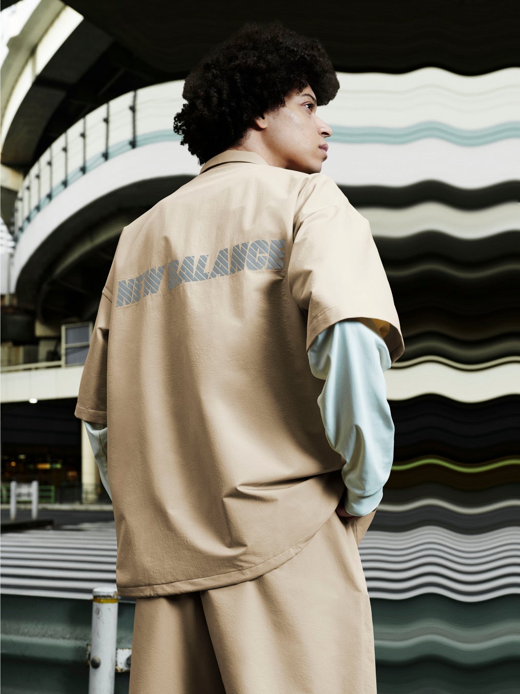 サープラスのウエアからインスパイアされたオリジナルアイテム。快適性を追求し、ストレッチ性と撥水性を備えながら美しいシルエットを保つ"ソロテックス(SOLOTEX®︎)"素材を起用したオーバーサイズ仕立ての半袖コーチシャツ。左胸と背中にはオリジナルグラフィックをリフレクトプリントで施したファッション性と機能性を兼ね備えたアイテム。