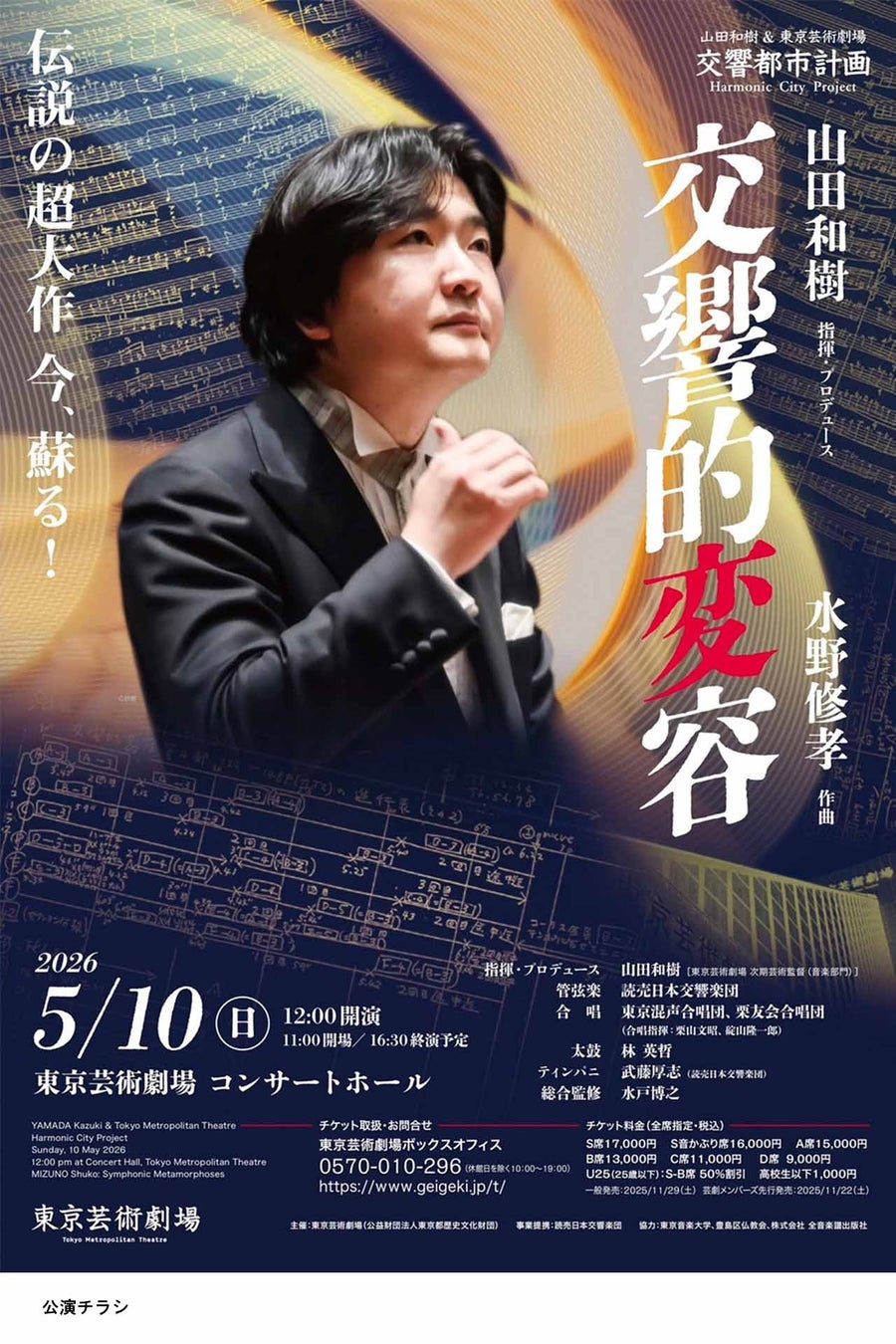 次期芸術監督(音楽部門)・山田和樹と東京芸術劇場が繰り広げる、新しいプロジェクト「山田和樹&東京芸術劇場 交響都市計画」。その第1弾として、編成・演奏時間ともに邦人作品史上最大級とされ、1992年の初演以来「再演は不可能」とされた、水野修孝作曲『交響的変容』の再演を行います。