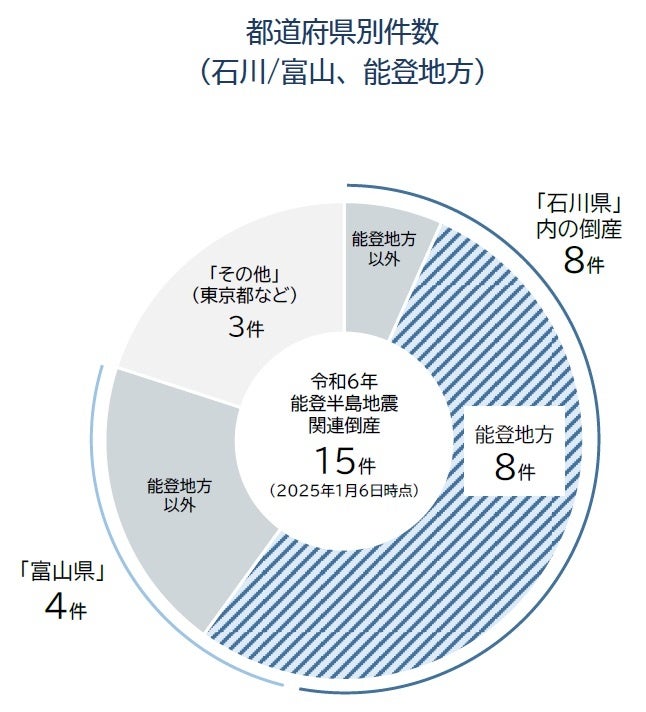 最大震度7を観測した令和6年能登半島地震の発生から1年が経過した。これまでに判明した、能登半島地震の影響による全国の企業倒産は、2025年1月6日時点で少なくとも15件となった。このうち、法的整理(負債1000万円以上)が13件、事業停止など実質的な破たん状態となったケースが2件となった。地域別にみると、特に被害の大きかった能登地方で8件発生し、地震関連倒産全体の過半数を占めた。都道府県別では、石川・富山の両県合わせて12件となった。