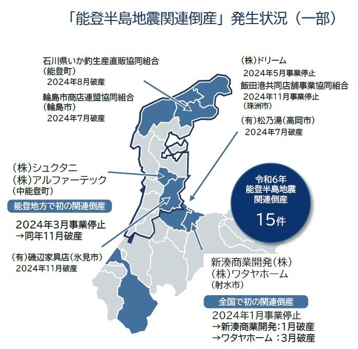 株式会社帝国データバンクでは、「令和6年能登半島地震(能登半島地震)」の発生に伴い、直接的・間接的に震災が影響したことが倒産要因であると判明した企業倒産(負債1000万円以上、個人事業主含む)および実質的な経営破たん状態となった企業を「能登半島地震関連倒産」と定義し、地震発生直後の2024年1月から同12月までの倒産動向について調査を取りまとめた。