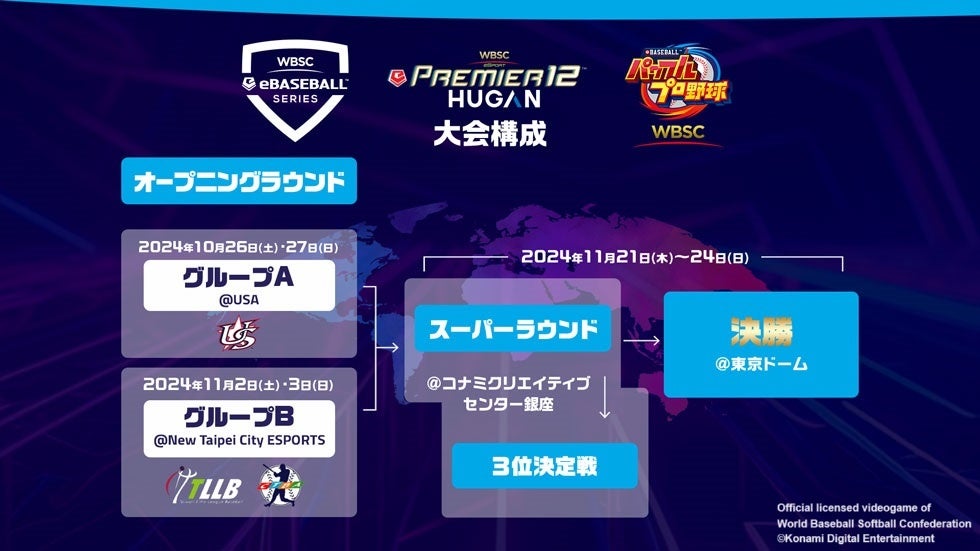 「ヒューガン WBSC eプレミア12 2024」は、世界野球ソフトボール連盟(WBSC)が主催し、当社が発売しているWBSC公式野球ゲーム『WBSC eBASEBALL™パワフルプロ野球』を競技タイトルとして実施されるeスポーツの世界大会です。野球eスポーツの世界王者を決める決勝戦は、同じくWBSCが主催する野球の国際大会「プレミア12」と合わせて、11月下旬に東京ドームでの開催が予定されています。