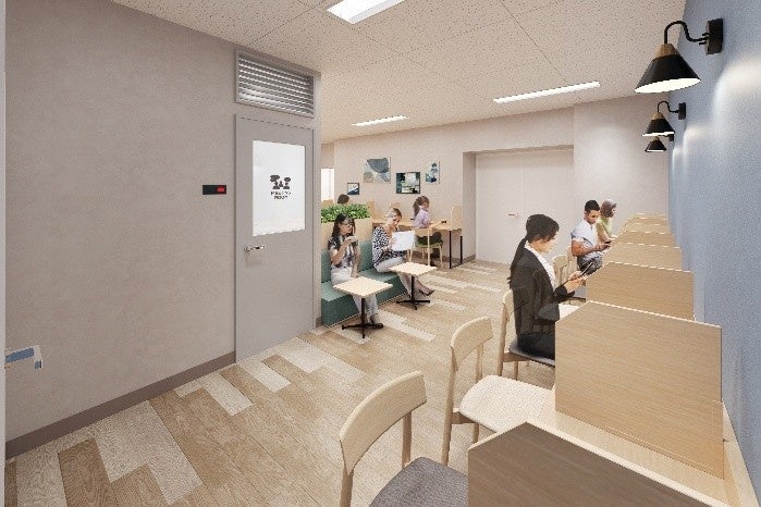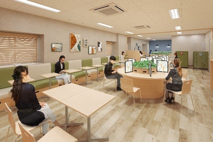 従業員の皆さまがゆっくりと休憩でき、働きやすい環境の実現とES(従業員満足度)向上を目指し、従業員休憩室を拡張・リニューアルします。打合せに利用できるミーティングルームや落ち着いて休憩できるソファ席を新設するほか、パウダールームを男女別とするなど、用途に応じて快適に利用できる空間を整えています。