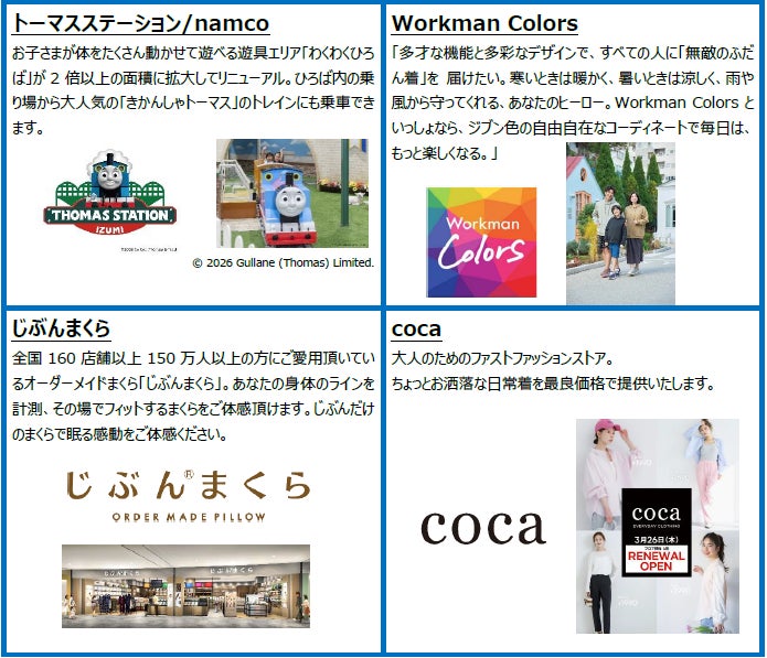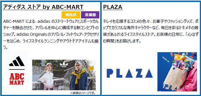 関西初出店かつ新業態となる「アディダス ストア by ABC-MART」や、大阪初出店の「茶薫小籠包」「Boogie ららぽーと和泉店」といった話題性のあるテナントに加え、飲食店舗の刷新や、男性・女性それぞれのニーズに応えるアパレル・雑貨・スポーツ系店舗を取りそろえた注目の22店舗が新たに加わります。また、「WORKMAN Plus」が「Workman Colors」の新業態へ生まれ変わる他、既存店舗の「ミスタードーナツ」、「トーマスステーション/namco」なども装いを新たに進化。家族連れをはじめ、さまざまな来館者が楽しめるラインアップがさらに充実します。